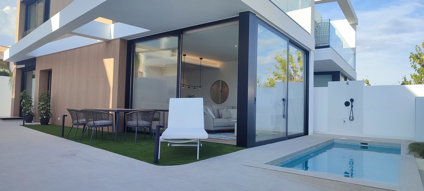 Brandneue Wohnanlage mit 4 luxuriösen Villen im modernen Stil mit 3 Schlafzimmern in Torre de la Horadada (Alicante), nur 300 Meter von den schönen Stränden entfernt und in der Nähe aller Annehmlichkeiten.