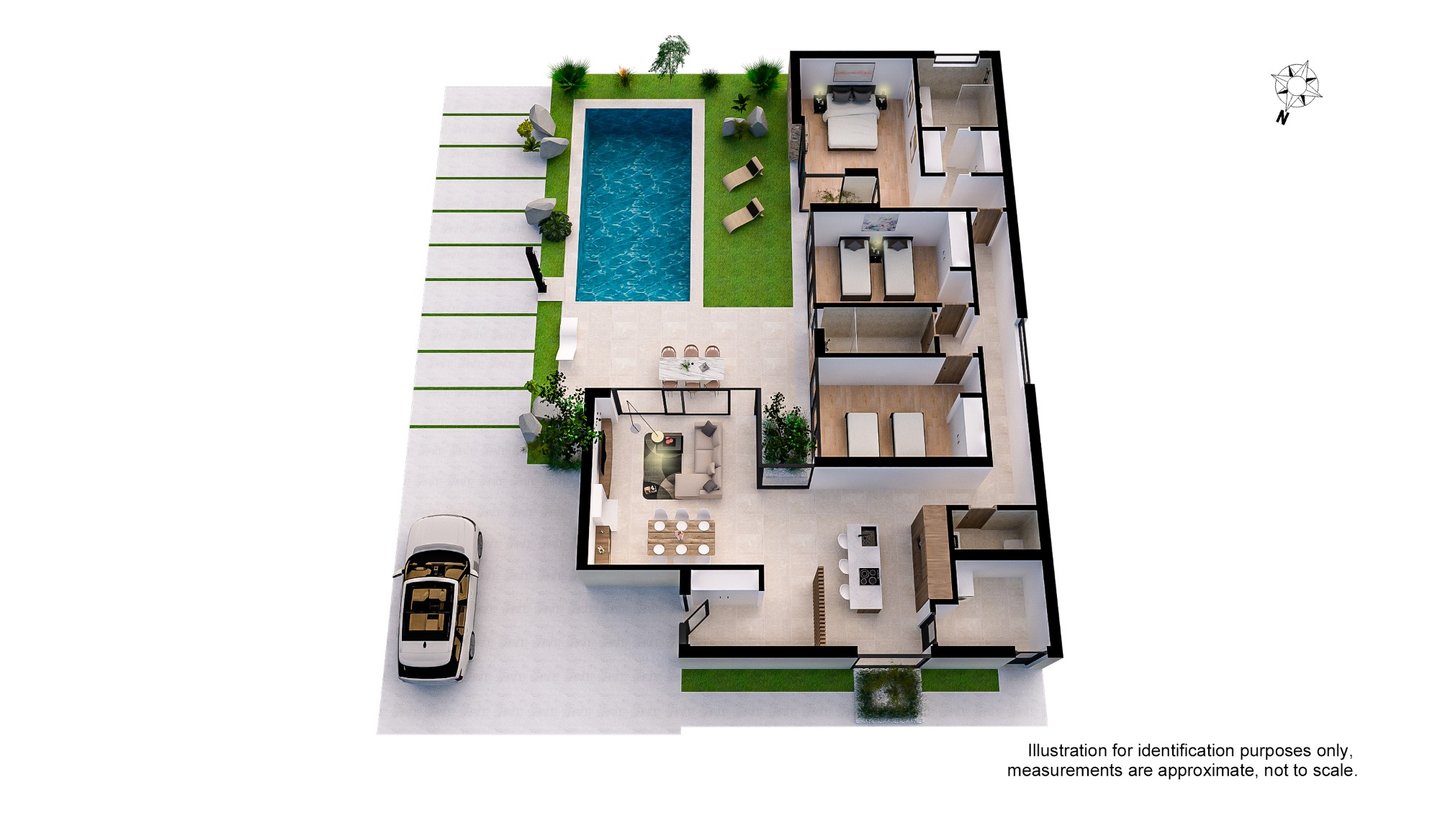 Die Villa befindet sich auf einer Ebene und besteht aus einem Eingangsbereich, der zum geräumigen Wohn- und Essbereich mit großen Fenstern führt, die Zugang zur Terrasse und zum Garten bieten, einer modernen amerikanischen Küche, einer separaten Waschküche, einer Gästetoilette, einer Master-Suite mit großem Schlafzimmer, en-suite Badezimmer und Ankleidebereich, zwei weiteren Doppelschlafzimmern und einem Gästebad. Die Eigenschaften kommen einschließlich voll installierte Klimaanlage, Fußbodenheizung im Wohnzimmer und Bäder, Küchengeräte (Herd und Dunstabzugshaube), Einbauschränke und USB-Steckdosen in allen Schlafzimmern, Hausautomation, Video-Gegensprechanlage, Innen- und Außen-LED-Beleuchtung, privater Parkplatz auf dem Grundstück, angelegten Garten und privaten Swimmingpool von 8x4, die Wartung des Pools, Gemeinschafts-, Privat-und Dachgärten wird im Rahmen der Gemeinschaft Gebühren der Eigentümer gewährleistet die Gärten sind immer in perfektem Zustand durchgeführt werden. Es gibt auch optionale Extras zur Auswahl, einschließlich Sonnenkollektoren, komplette Küche elektrische Geräte, Gas-System, elektrische Auto Ladepunkt, Kamin, Aufzug (für Villen mit zwei Etagen) und zusätzlichen Stauraum im Flur.