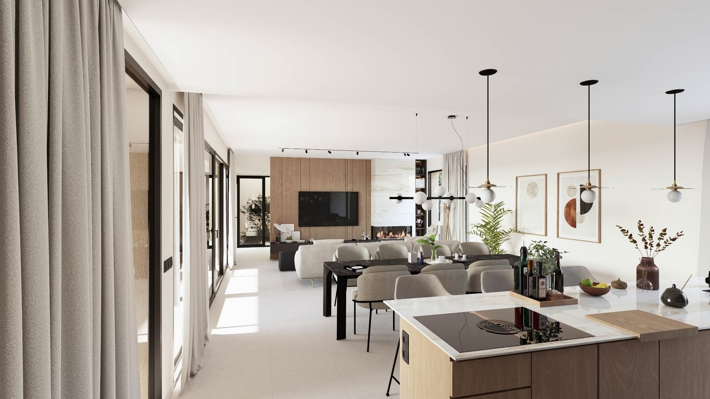 Die Architekten und Designer wissen, wie sich eine Immobilie in ihre Umgebung einfügen muss. Die Villen sind niedrig gebaut, um die Landschaft nicht zu erdrücken. Wenn man im Garten steht, hat man den Eindruck, sich in den Bergen zu befinden. Die Wände sind teilweise mit einer Steinfassade versehen, die ein warmes, natürliches Erscheinungsbild erzeugt und es dem Gebäude ermöglicht, mit der Umgebung zu verschmelzen, während es gleichzeitig eine effiziente thermische Barriere darstellt.