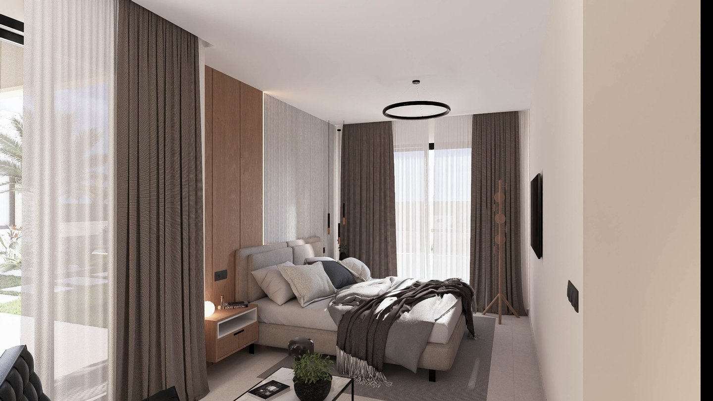 Der Grundriss der Villa befindet sich auf einer Ebene und besteht aus einem Eingangsbereich mit Gästetoilette und Abstellraum, der zum geräumigen offenen Wohn- und Essbereich mit großen Fenstern führt, die Zugang zur Terrasse und zum Garten bieten, einer modernen Küche im amerikanischen Stil, einer separaten Waschküche, einer Master-Suite mit großem Schlafzimmer, en-suite Badezimmer und großem Ankleidebereich, drei weiteren Doppelschlafzimmern (eines davon mit en-suite Badezimmer) und einem separaten Gästebad. Die Wohnungen verfügen über eine voll installierte Klimaanlage, Fußbodenheizung im Wohnzimmer und in den Bädern, Küchengeräte (Herd und Dunstabzugshaube), Einbauschränke und USB-Steckdosen in allen Schlafzimmern, Hausautomation, Video-Gegensprechanlage, LED-Beleuchtung innen und außen, einen privaten Parkplatz auf dem Grundstück, einen angelegten Garten und einen privaten Swimmingpool von 8x4, die Pflege des Pools, der Gemeinschafts-, Privat- und Dachgärten wird im Rahmen der Gemeinschaftsgebühren der Eigentümer durchgeführt, um sicherzustellen, dass die Gärten immer in perfektem Zustand sind. Es gibt auch optionale Extras zur Auswahl, einschließlich Sonnenkollektoren, komplette Küche elektrische Geräte, Gas-System, elektrische Auto Ladepunkt, Kamin, Aufzug (für Villen mit zwei Etagen) und zusätzlichen Stauraum im Flur.