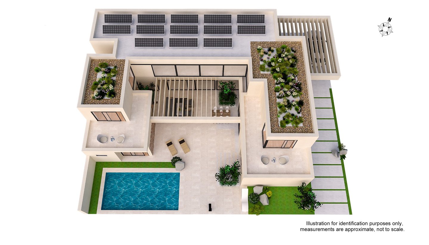 Die Villa erstreckt sich über zwei Ebenen und besteht aus einem Eingangsbereich mit Gäste-WC und Abstellraum, der zu einem geräumigen offenen Wohn- und Essbereich mit großen Fenstern führt, die Zugang zur Terrasse und zum Garten bieten, einer modernen Küche im amerikanischen Stil, einer separaten Waschküche, einer Master-Suite mit großem Schlafzimmer, eigenem Bad und großem Ankleidebereich, drei weiteren Doppelschlafzimmern (eines davon mit eigenem Bad) und einem separaten Gästebad. Die interne Treppe führt Sie in den ersten Stock mit einem großzügigen zweiten Wohnbereich, zwei weiteren Doppelschlafzimmern, beide mit en-suite Badezimmern (eines davon mit einem großen Ankleidebereich), jedes Schlafzimmer hat auch Zugang zu einer eigenen Sonnenterrasse und die übergroßen Fenster im Wohnbereich erlauben Ihnen, die atemberaubende Aussicht zu genießen. Die Wohnungen verfügen über eine voll installierte Klimaanlage, Fußbodenheizung im Wohnzimmer und in den Bädern, Küchengeräte (Herd und Dunstabzugshaube), Einbauschränke und USB-Steckdosen in allen Schlafzimmern, Hausautomation, Video-Gegensprechanlage, LED-Beleuchtung innen und außen, einen privaten Parkplatz auf dem Grundstück, einen angelegten Garten und einen privaten Pool von 8x4, die Pflege des Pools, der Gemeinschafts-, Privat- und Dachgärten wird im Rahmen der Gemeinschaftsgebühren der Eigentümer durchgeführt, so dass die Gärten immer in perfektem Zustand sind. Es gibt auch optionale Extras zur Auswahl, einschließlich Sonnenkollektoren, komplette Küche elektrische Geräte, Gas-System, elektrische Auto Ladepunkt, Kamin, Aufzug (für Villen mit zwei Etagen) und zusätzlichen Stauraum im Flur.