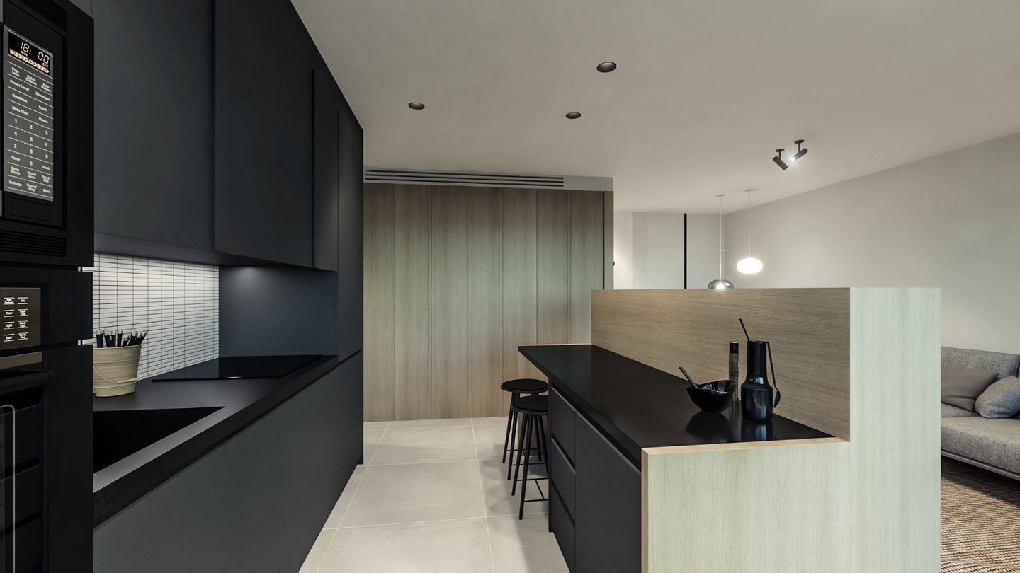 Die Innenausstattung besteht aus einem hellen, offenen Wohn- und Essbereich mit moderner amerikanischer Küche, großen Terrassentüren vom Wohnbereich aus, die Zugang zur großzügigen Terrasse bieten, einem Hauptschlafzimmer mit eigenem Bad, einem weiteren Doppelschlafzimmer und einem Gästebad. Die Wohnungen im Erdgeschoss verfügen über einen privaten Gartenbereich an der Vorderseite des Anwesens mit direktem Zugang zum Poolbereich und zur hinteren Terrasse. Die Wohnungen verfügen über Elektrogeräte in der Küche (Backofen, Kochfeld, Dunstabzugshaube, Kühlschrank mit Gefrierfach, Mikrowelle, Geschirrspüler und Waschmaschine), Einbauschränke in allen Schlafzimmern, einen privaten Parkplatz und Abstellraum sowie eine Ladestation für Elektrofahrzeuge.