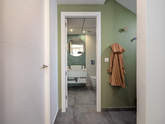 Die Innenräume vereinen Funktionalität und Design in offenen Räumen, die direkt mit den Außenterrassen verbunden sind. Das Ziel bei der Gestaltung ist es, die Belüftung und das natürliche Licht in den Villen optimal zu nutzen. Das Layout dieser Modellvilla besteht aus einem geräumigen offenen Wohn- und Essbereich mit moderner amerikanischer Küche, Terrassentüren im gesamten Hauptwohnbereich, die viel natürliches Licht schaffen und Zugang zur Terrasse und zum Garten bieten, im Erdgeschoss befinden sich außerdem zwei Doppelschlafzimmer und ein Gästebad. Die interne Treppe führt Sie in den ersten Stock, wo sich das Hauptschlafzimmer mit eigenem Bad und einer Sonnenterrasse von 25 m2 befindet. Die Terrasse und der Garten im Erdgeschoss bieten die Möglichkeit, rund um den privaten Swimmingpool zu entspannen und im Freien zu speisen und das schöne Klima zu genießen.