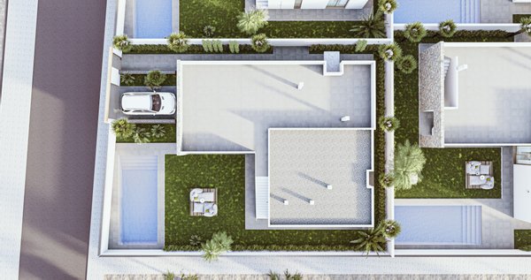 Die Villen befinden sich alle auf einer Ebene und die Innenaufteilung besteht aus einem Eingangsflur, der zu einem geräumigen, offenen Wohn- und Essbereich mit großen Fenstern im gesamten Wohnbereich führt, die viel natürliches Licht hereinlassen und auch Zugang zur Terrasse und zum Garten bieten, einer voll ausgestatteten Designerküche mit Mittelinsel und einer separaten Waschküche. Das beeindruckende Hauptschlafzimmer verfügt über ein eigenes Bad, einen Ankleidebereich und einen begehbaren Kleiderschrank sowie eine Terrassentür zur Hauptterrasse. Außerdem gibt es zwei weitere Doppelschlafzimmer und ein separates Gästebad. Es gibt einen großen Außenbereich mit großen Terrassen, einen Garten mit privatem Swimmingpool und eine Außentreppe, die zur privaten Dachterrasse von 76 m2 führt, wo man den ganzen Tag über die Sonne genießen kann.