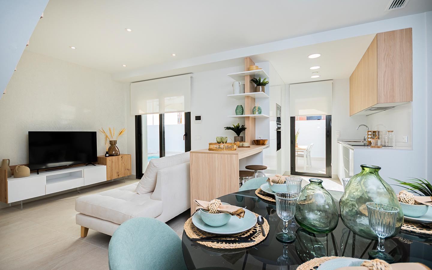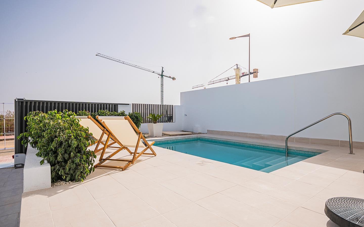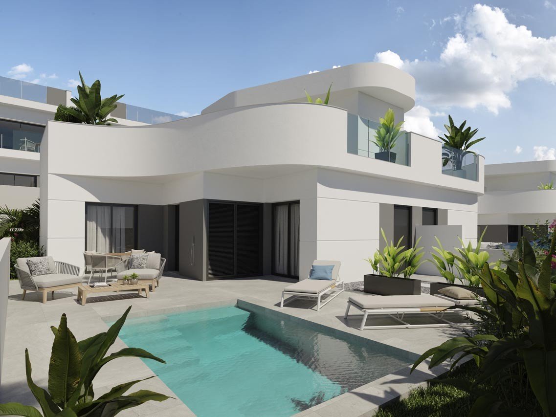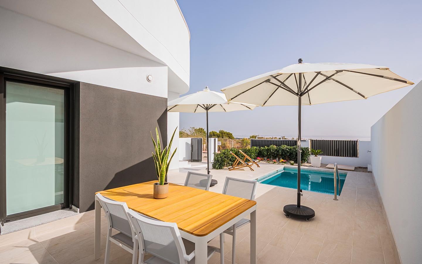 Eine brandneue exklusive Wohnanlage mit Doppelhaushälften mit 3 Schlafzimmern, 3 Bädern und privatem Pool in Los Balcones (Alicante) mit herrlichem Blick auf die Laguna Rosa de Torrevieja und das Mittelmeer, in der Nähe von allen Annehmlichkeiten und eine kurze Fahrt zu den schönen Stränden.