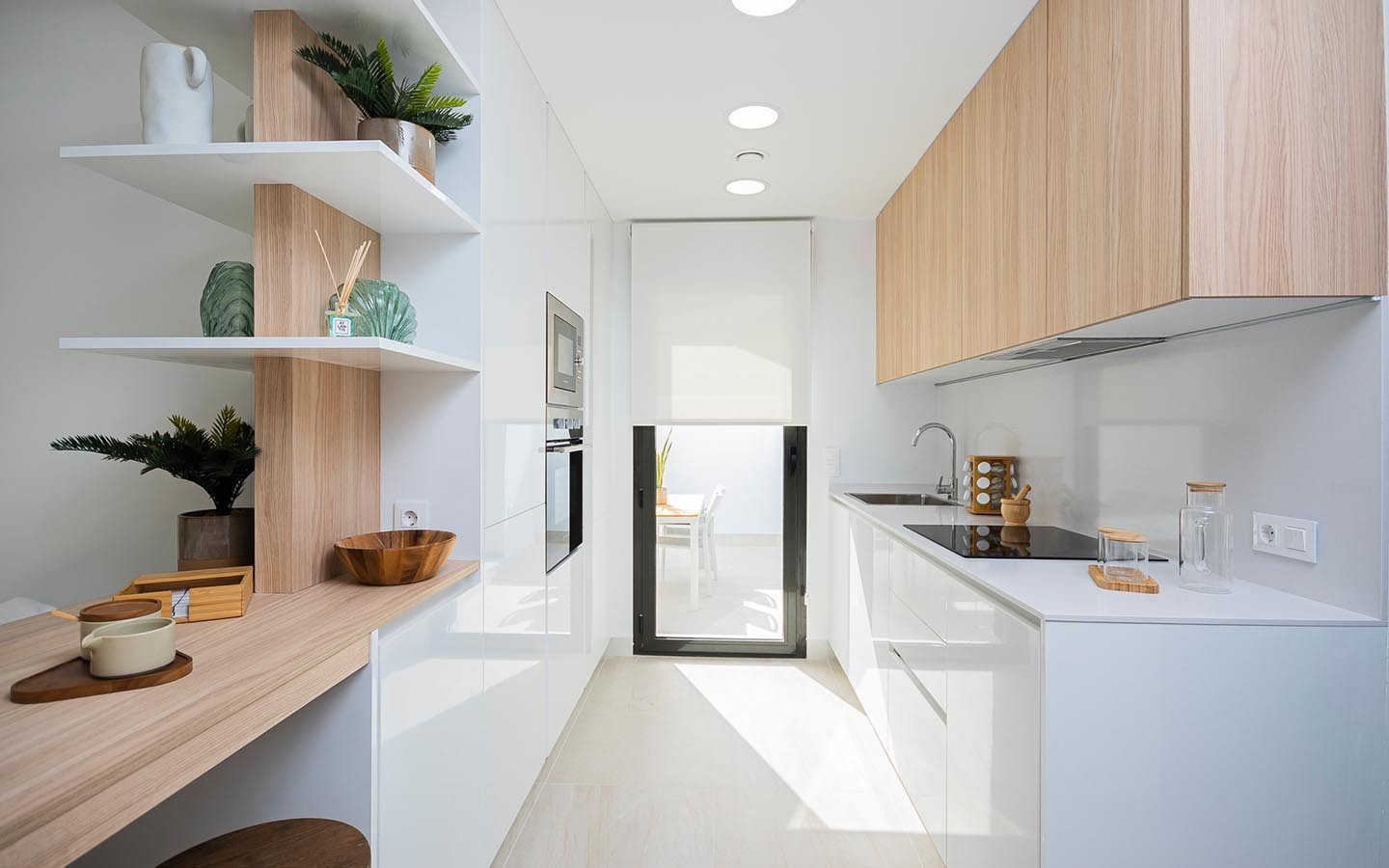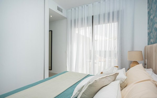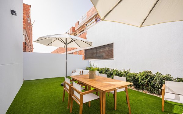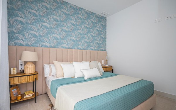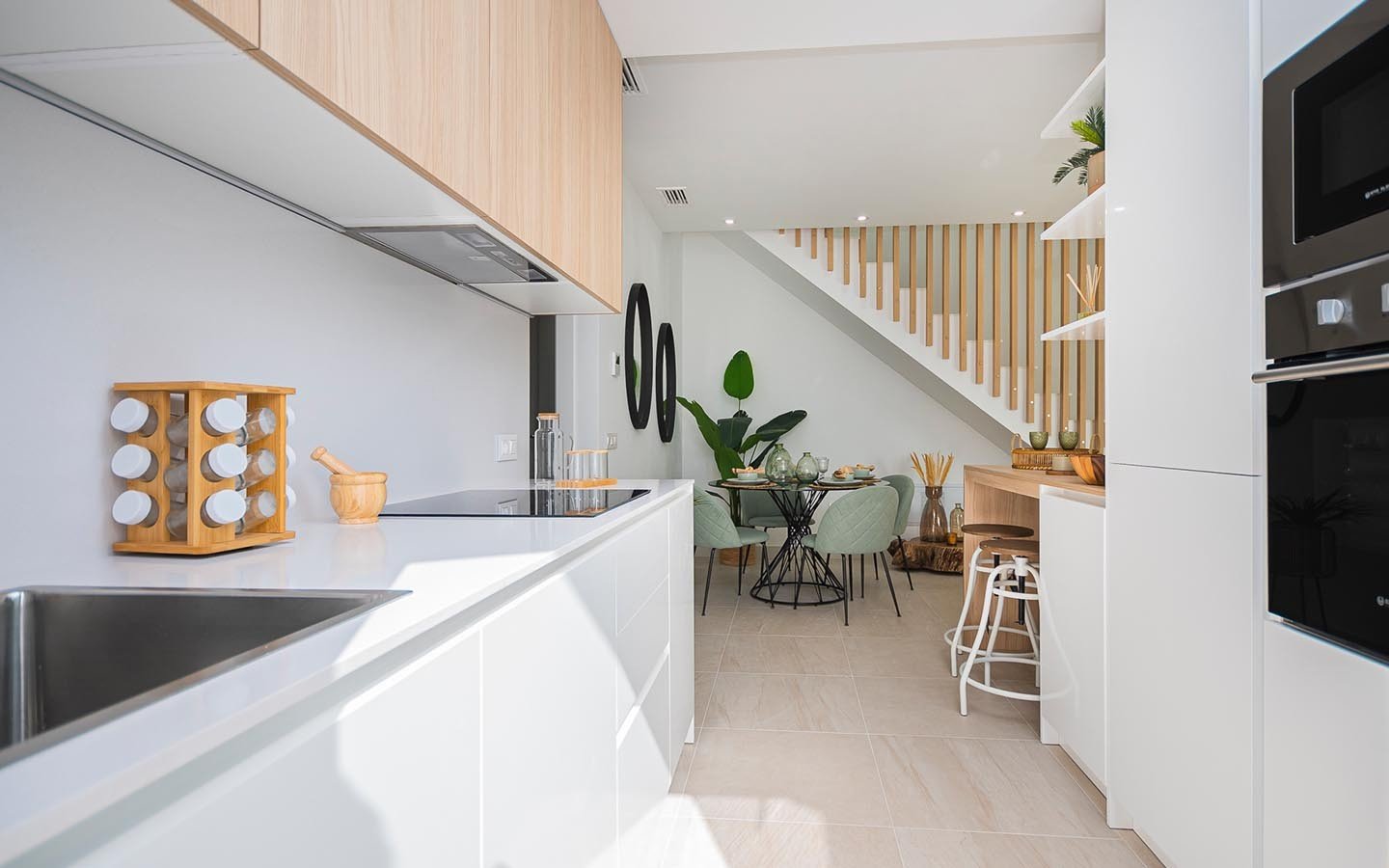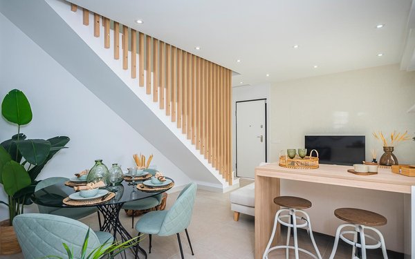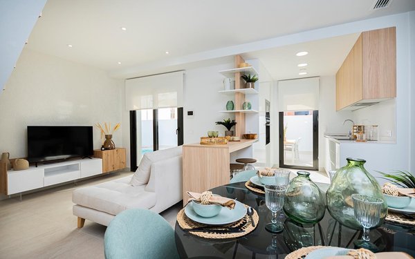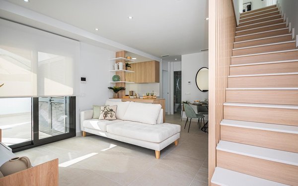 Die Anlage ist so konzipiert, dass sie den perfekten mediterranen Lebensstil vermittelt. Die Außenbereiche sind wunderschön mit weißen Fassaden gestaltet und die Innenräume verfügen über eine offene Bauweise mit viel natürlichem Licht. Die Doppelhaushälften zeichnen sich durch ein perfektes Gleichgewicht aus, das die Kombination von reinen und minimalistischen Linien mit anderen geschwungenen und organischen Linien, sehr elegant, vermittelt.