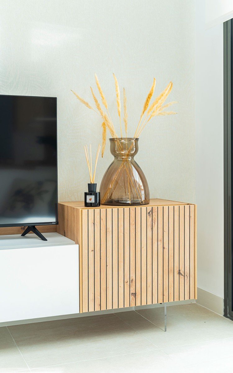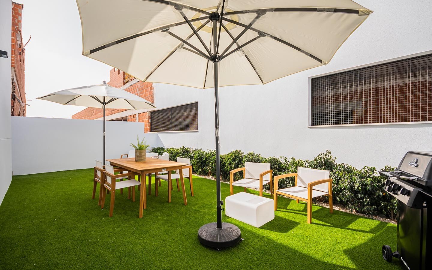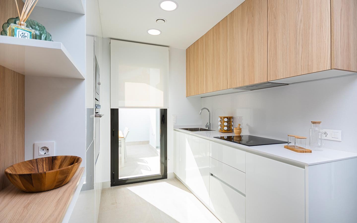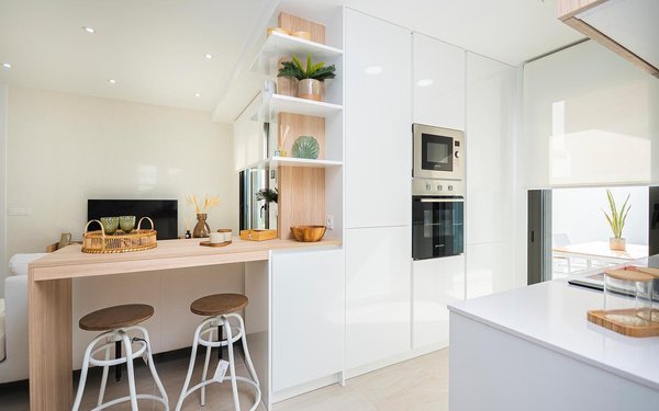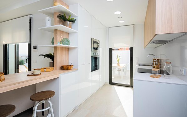 Die Anlage ist so konzipiert, dass sie den perfekten mediterranen Lebensstil vermittelt. Die Außenbereiche sind wunderschön mit weißen Fassaden gestaltet und die Innenräume verfügen über eine offene Bauweise mit viel natürlichem Licht. Die Doppelhaushälften zeichnen sich durch ein perfektes Gleichgewicht aus, das die Kombination von reinen und minimalistischen Linien mit anderen geschwungenen und organischen Linien, sehr elegant, vermittelt.