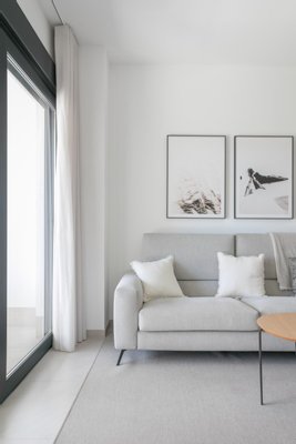 Die Innenausstattung umfasst einen offenen Wohn- und Essbereich mit Terrassentüren, die Zugang zur privaten Terrasse bieten, eine moderne Küche im amerikanischen Stil mit verschiedenen Farben für die Küchenmöbel und Arbeitsplatten, ein Hauptschlafzimmer mit eigenem Bad, ein weiteres Doppelschlafzimmer und ein separates Gästebad. Auf der privaten Terrasse gibt es einen Abstellraum für die Waschmaschine und den Heizkessel. Die Wohnungen verfügen über eine vorinstallierte Klimaanlage, Elektrogeräte in der Küche (Backofen, Cerankochfeld, Dunstabzugshaube, Mikrowelle, Kühl- und Gefrierschrank, Geschirrspüler, Waschmaschine und Trockner), Einbauschränke in allen Schlafzimmern, elektrische Jalousien im Wohnzimmer und in den Schlafzimmern sowie einen eigenen Parkplatz.