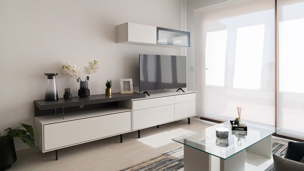 Die Innenaufteilung besteht aus einem geräumigen offenen Wohn- und Essbereich mit Terrassentüren, die Zugang zur Terrasse bieten, einer modernen Küche im amerikanischen Stil mit einem separaten Hauswirtschaftsraum, einem Hauptschlafzimmer, einem weiteren Doppelschlafzimmer und einem separaten Gästebad, das durch eine Doppeltür vom Hauptschlafzimmer und vom Flur aus zugänglich ist. In den Apartmentoptionen mit zwei Badezimmern ist das zusätzliche Badezimmer ein en-suite Badezimmer zum Hauptschlafzimmer. Die Wohnungen verfügen über eine vorinstallierte Klimaanlage, eine Fußbodenheizung in den Bädern der Premium-Wohnungen, Einbauschränke in allen Schlafzimmern, eine TV-Empfangsanlage und einen privaten Tiefgaragenstellplatz. Es gibt verschiedene optionale Extras, wie z.B. die Wahl zwischen verschiedenen Möbelpaketen, um die Wohnungen auf einem sehr hohen Standard einzurichten.