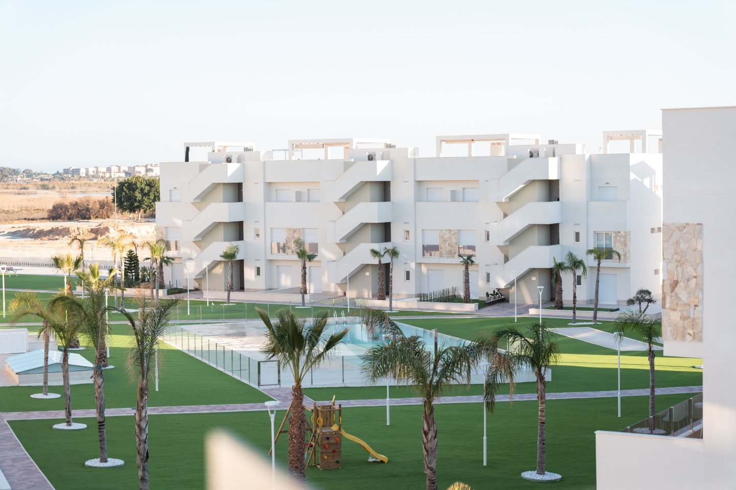 Ein brandneuer privater Wohnkomplex mit 135 Wohnungen mit 2 und 3 Schlafzimmern in El Raso, einem Viertel von Guardamar del Segura (Alicante), das an die Naturlandschaft der Salzlagune La Mata grenzt und nur eine kurze Fahrt von den herrlichen