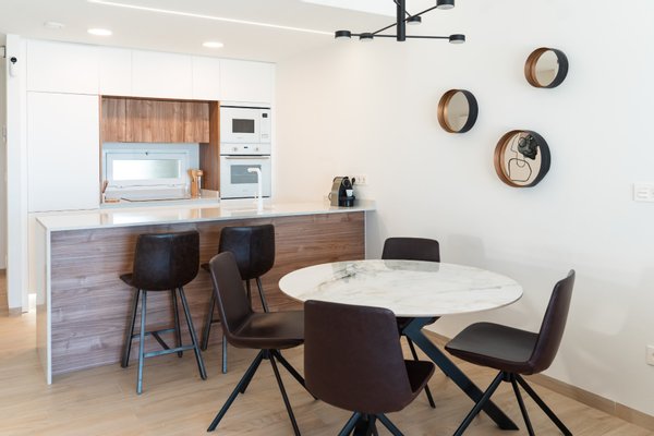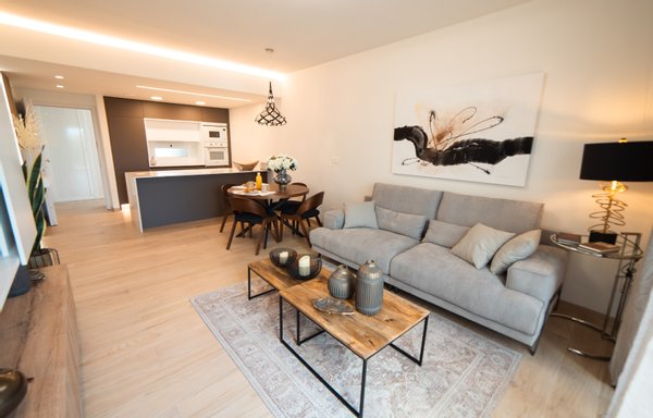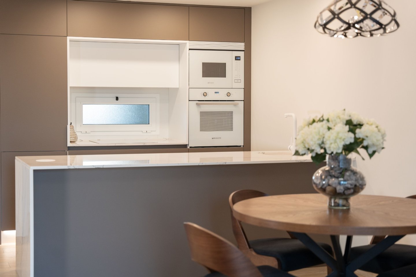 Die Wohnblöcke erstrecken sich über fünf Ebenen und sind alle nach Süden ausgerichtet. Die Innenaufteilung besteht aus einer Eingangshalle, die zu einem geräumigen offenen Wohn- und Essbereich mit Terrassentüren führt, die Zugang zur Terrasse bieten, einer voll ausgestatteten modernen amerikanischen Küche, einem Hauswirtschaftsraum, einem Hauptschlafzimmer mit eigenem Bad, einem weiteren Doppelschlafzimmer und einem separaten Gästebad. Die Penthouse-Varianten verfügen über eine Außentreppe auf der Terrasse, über die man auf die weitläufige Dachterrasse mit Sommerküche, Außendusche und Jacuzzi-Bereich gelangt. Die Wohnungen verfügen über eine vorinstallierte Klimaanlage, Einbauschränke in allen Schlafzimmern, LED-Innenbeleuchtung, Gegensprechanlage und einen privaten Tiefgaragenstellplatz. Optional können Sie einen Abstellraum erwerben.