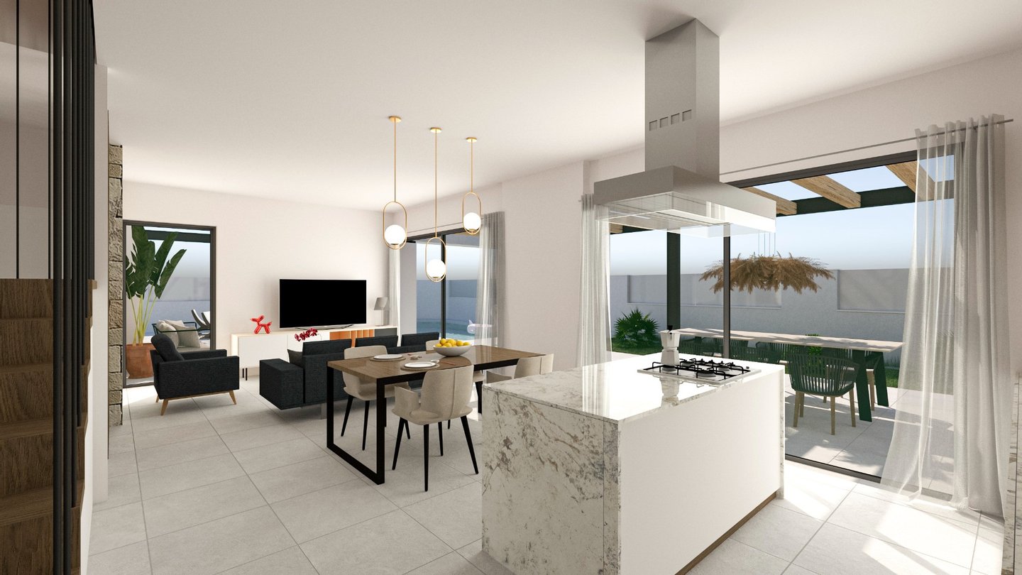 Das Layout der Villa besteht aus einem Eingangsbereich, der zum hellen und geräumigen offenen Wohn- und Essbereich mit großen Fenstern führt, die viel natürliches Licht durch das Anwesen strömen lassen und Zugang zur Terrasse und zum Garten bieten, einer großen, voll ausgestatteten amerikanischen Küche, einer Waschküche, einem Doppelschlafzimmer und einem separaten Gästebad im Erdgeschoss. Die interne Treppe führt Sie in den ersten Stock mit der Master-Suite, die ein großes Schlafzimmer, ein eigenes Bad, einen großen Ankleidebereich und eine private Sonnenterrasse hat. Die interne Treppe gibt auch Zugang zu den umfangreichen Dachterrasse von 42m2, um die Sonne den ganzen Tag lang zu genießen.