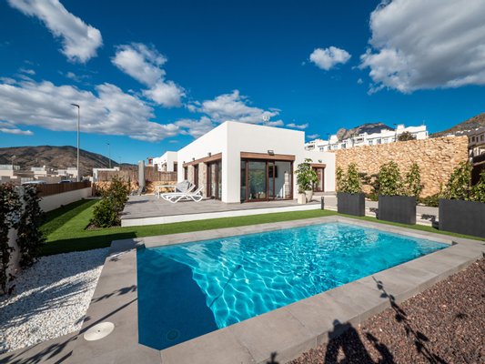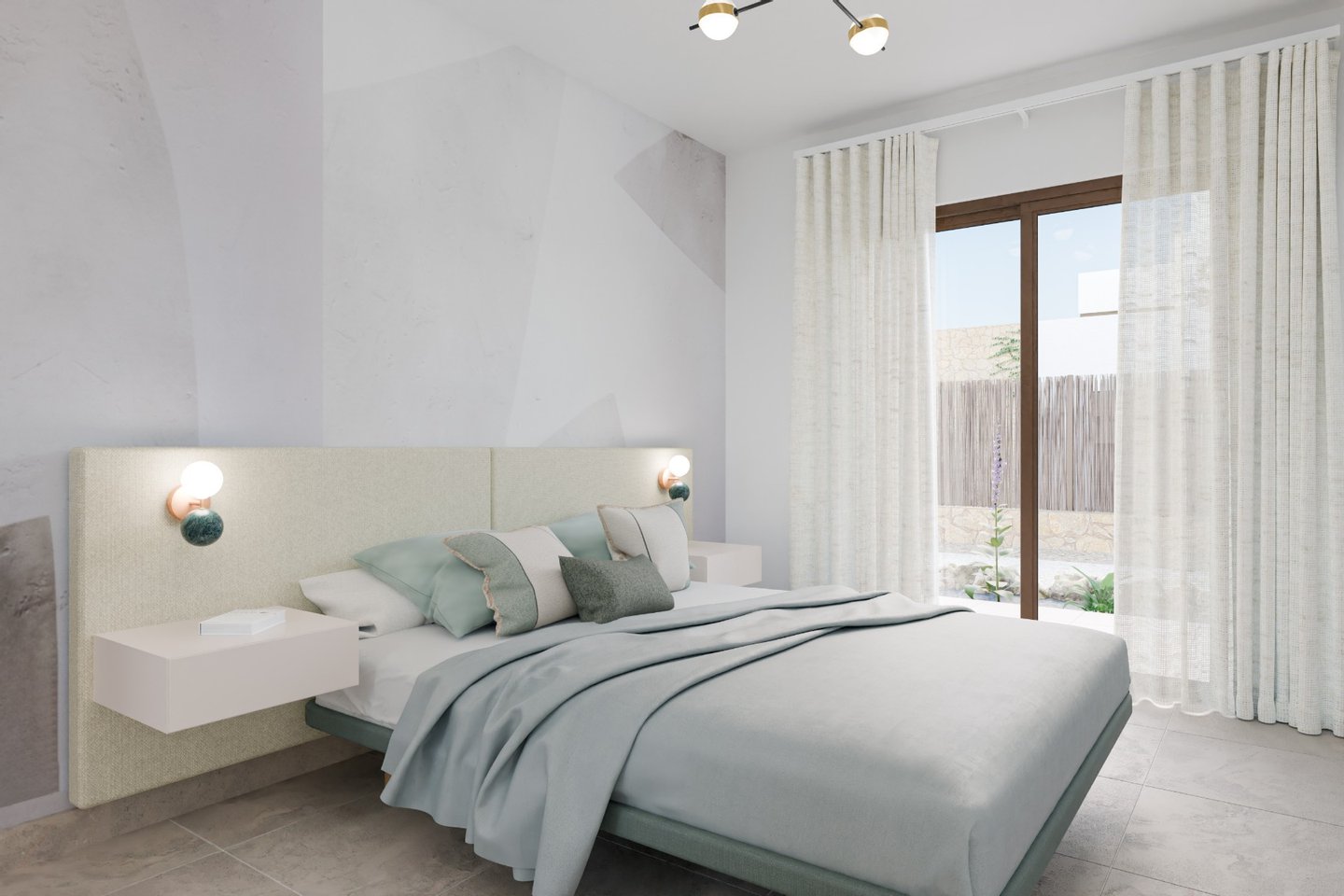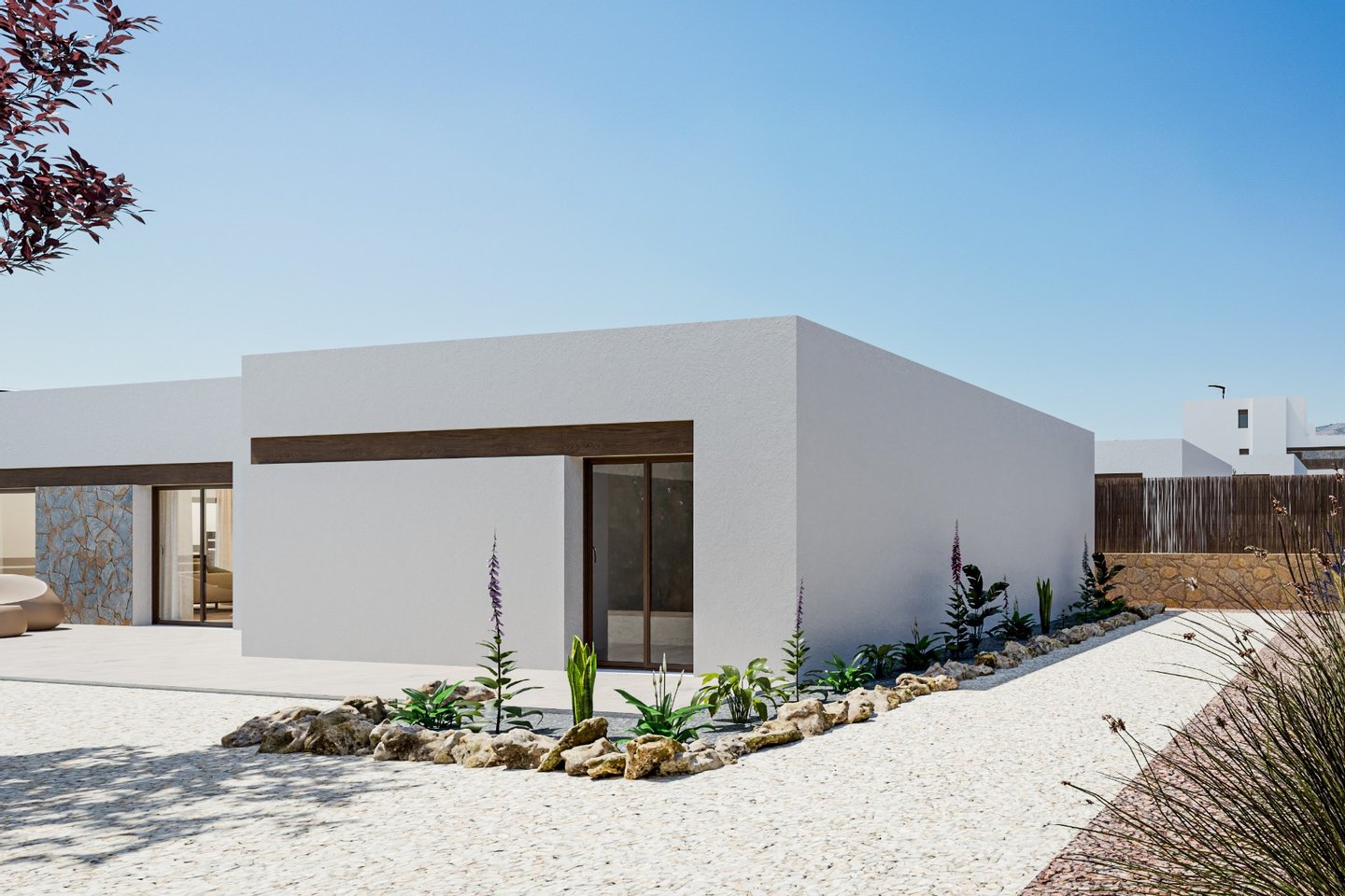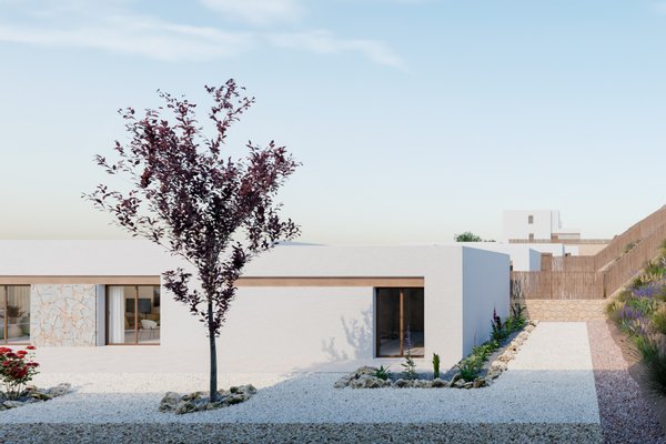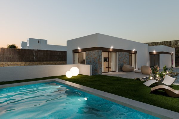 Dieses Projekt besteht aus zwei verschiedenen Villenmodellen. Dieses besondere Modell ist auf einer Ebene verteilt und die Innenaufteilung umfasst einen Eingangsbereich, der zum hellen und geräumigen offenen Wohn- und Essbereich mit mehreren großen Fenstern im gesamten Wohnbereich führt, die viel natürliches Licht schaffen und Zugang zur Terrasse bieten, eine voll ausgestattete moderne Küche im amerikanischen Stil, ein Hauptschlafzimmer mit eigenem Bad und Terrassentür mit Zugang zur Hauptterrasse, zwei weitere Doppelschlafzimmer und ein separates Gästebad. Die Immobilie verfügt über einen großen Außenbereich mit Terrassen und einem Garten, der zum Entspannen rund um den privaten Swimmingpool einlädt, sowie über Bereiche, in denen Gäste im Freien speisen können.