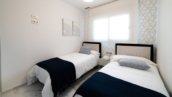 Die Innenausstattung besteht aus einem geräumigen, offenen Wohn- und Essbereich mit Terrassentüren, die auf die Terrasse führen, mit Glas, das für Helligkeit sorgt und die atemberaubende Aussicht ermöglicht, einer voll ausgestatteten, zeitgenössisch gestalteten Küche mit einem separaten Hauswirtschaftsraum, einem Hauptschlafzimmer mit eigenem Bad und Terrassentür zur Terrasse, zwei weiteren Doppelschlafzimmern und einem separaten Gästebad. Eine interne Treppe führt Sie auf die 147 m2 oder 163 m2 große Dachterrasse, auf der Sie den ganzen Tag über die Sonne genießen können.