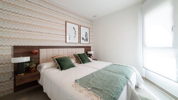 Die Innenausstattung besteht aus einem geräumigen, offenen Wohn- und Essbereich mit Terrassentüren, die einen herrlichen Blick und Zugang zur Terrasse bieten, einer voll ausgestatteten, modernen Küche und einem separaten Hauswirtschaftsraum, einem Hauptschlafzimmer mit eigenem Bad und Zugang zur Terrasse, zwei weiteren Doppelschlafzimmern und einem separaten Gästebad. Die Häuser sind mit hochwertigen Materialien gebaut und so konzipiert, dass sie Ihnen das Leben leichter machen. Sie verfügen alle über eine Klimaanlage, Fußbodenheizung in den Bädern, einen elektrischen Handtuchhalter in Bad 1, eine gemeinschaftliche Wasserenthärtungsanlage, die die Qualität des Leitungswassers verbessert, einen Siemens-Dunstabzug in der Küche (andere Elektrogeräte sind optional), Einbauschränke in allen Schlafzimmern, LED-Beleuchtung, motorisierte Jalousien, Video-Gegensprechanlage, Installation von TV-Empfangsgeräten, alle Wohnungen verfügen über einen Parkplatz entweder im Untergeschoss des Gebäudes mit einer Ladestation für ein Elektrofahrzeug oder auf dem Außenparkplatz mit Vorinstallation für eine Ladestation für ein Elektrofahrzeug, sowie Gemeinschaftsbereiche für das Abstellen von Fahrrädern.