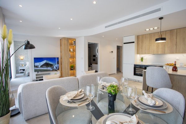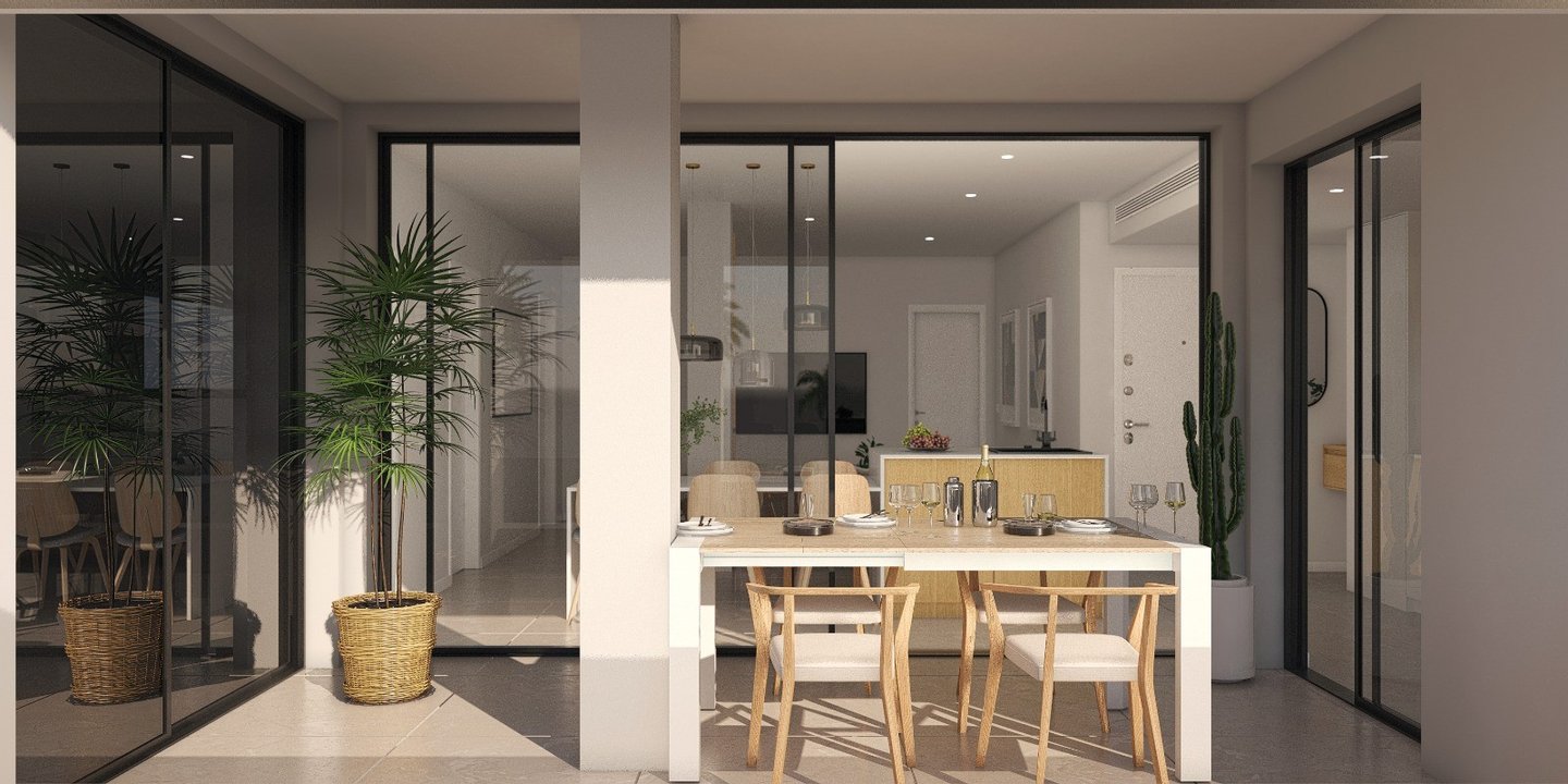 Die Innenausstattung besteht aus einem geräumigen offenen Wohn- und Essbereich mit großen Terrassentüren, die Zugang zur Terrasse bieten, einer voll ausgestatteten amerikanischen Küche, einem Hauptschlafzimmer mit eigenem Bad, zwei weiteren Doppelschlafzimmern und einem separaten Gästebad. Die Wohnungen verfügen über eine Klimaanlage, Fußbodenheizung in den Bädern, elektrische Küchengeräte von Bosch oder Siemens, LED-Beleuchtung innen und außen, elektrische Rollläden und eine private Tiefgarage mit einer Ladestation für Elektrofahrzeuge und einem Abstellraum. Die Penthouse-Wohnungen verfügen außerdem über eine private Sonnenterrasse, eine Toilette, eine Pergola, einen elektrischen Grill, eine Sommerküche, einen Kunstrasen, eine Außendusche und eine Vorinstallation für einen Jacuzzi. Optional gibt es für alle Wohnungstypen ein hochwertiges Möbelpaket.