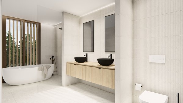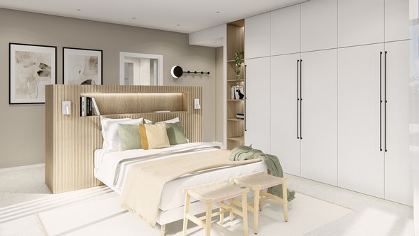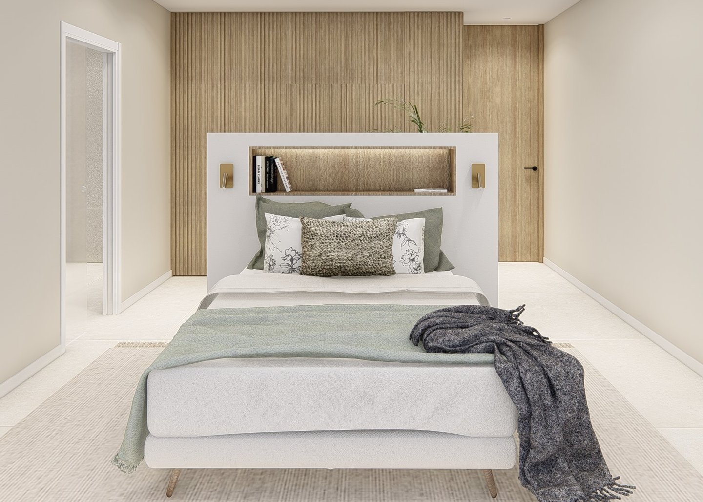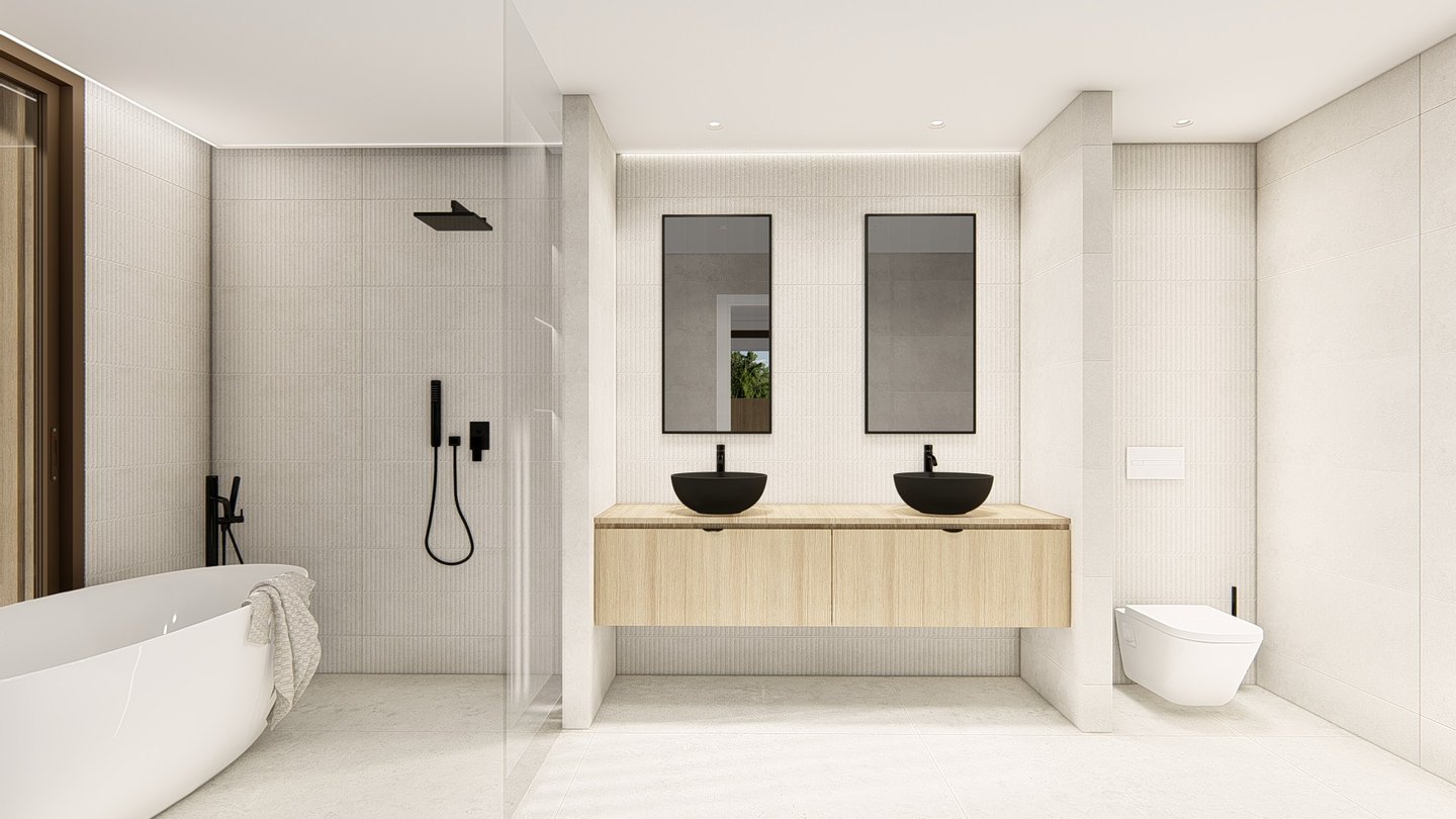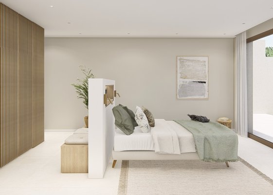 Das erste Villenmodell hat Zugang zu den anderen Schlafzimmern im Untergeschoss, wo sich eine Waschküche, das Hauptschlafzimmer mit eigenem Bad mit Badewanne und ein weiteres Doppelschlafzimmer mit eigenem Bad befinden. Beide Schlafzimmer haben Terrassentüren, die Zugang zu einer Terrasse und dem Garten bieten. Das zweite Villenmodell hat eine ähnliche Aufteilung, aber im ersten Stock mit Sonnenterrassen, die entweder vom Flur im ersten Stock oder vom Hauptschlafzimmer aus zugänglich sind. Bei dieser Villa gibt es auch ein Untergeschoss, in dem sich die Waschküche befindet und die Möglichkeit besteht, zwei weitere Doppelschlafzimmer und zwei Bäder hinzuzufügen, wodurch die Villa zu einem Haus mit fünf Schlafzimmern wird. Beide Villenoptionen verfügen über eine private Garage für mehrere Autos, die auch vom Inneren der Immobilie aus zugänglich ist.