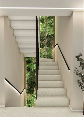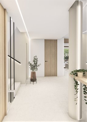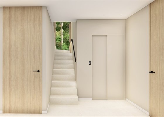Die Innenaufteilung besteht aus einem Eingangsbereich, der zu einem geräumigen und hellen offenen Wohn- und Essbereich mit großen, vom Boden bis zur Decke reichenden Fenstern führt, die viel natürliches Licht in das Haus strömen lassen und Zugang zur Terrasse bieten, einer atemberaubenden Küche mit Doppelfenstern, einer Gästetoilette und einem großen Doppelschlafzimmer mit eigenem Bad. Es besteht die Möglichkeit, entweder die Treppe oder den Aufzug zu benutzen, die Zugang zu jeder Etage bieten.