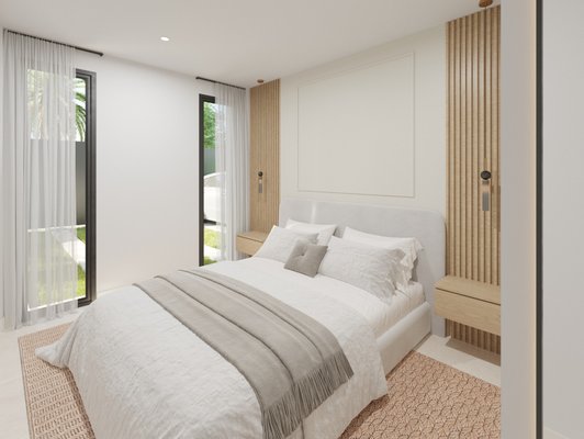Einer der Höhepunkte dieser Luxusvillen ist die ebenerdige Bauweise, die sie für alle Altersgruppen zugänglich und komfortabel macht. Die Inneneinrichtung besteht aus einem geräumigen, offenen Wohn- und Essbereich, der zum Pool und zum Grillplatz hin ausgerichtet ist, großen Fenstern im gesamten Wohnbereich, die viel natürliches Licht hereinlassen, einer voll ausgestatteten modernen Küche im amerikanischen Stil, einer Waschküche, einer beeindruckenden Master-Suite mit großem Schlafzimmer, eigenem Bad und begehbarem Kleiderschrank / Ankleidebereich, zwei weiteren geräumigen Schlafzimmern und einem separaten Gästebad. Die Außentreppe auf der Rückseite der Immobilie führt Sie auf die große Dachterrasse von fast 38m2.