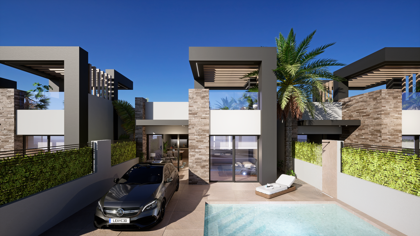 Ein brandneues Projekt von freistehenden Villen im zeitgenössischen Stil mit 3 Schlafzimmern in San Fulgencio (Alicante), einer etablierten Gegend mit