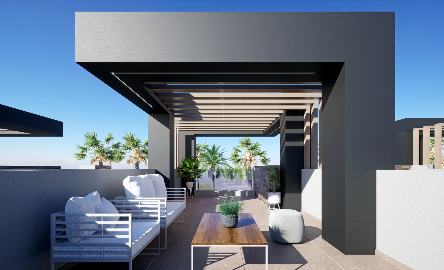 Diese atemberaubenden Villen zeichnen sich durch ihr einzigartiges Design und die hohe Qualität der Ausführung aus. Jede Villa verfügt über 3 Schlafzimmer und 2 Bäder mit einer großen Dachterrasse mit einer Pergola, große Terrasse mit dem optionalen Extra eines mediterranen Stil privaten Swimmingpool von 5 x 2,5 m.