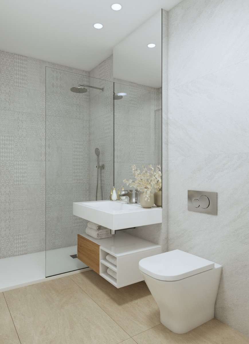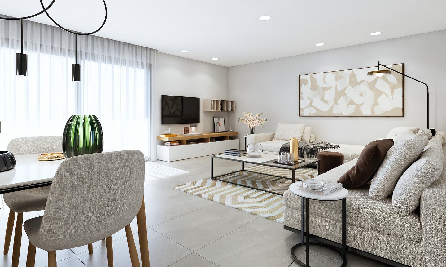 Die Wohnungen verfügen über 3 Schlafzimmer und 2 Bäder. Die Innenaufteilung besteht aus einem Eingangsbereich, der zu einem großen offenen Wohn- und Essbereich mit Terrassentüren führt, die auf die geräumige Terrasse führen, einer voll ausgestatteten modernen amerikanischen Küche mit einer separaten Speisekammer, die den Küchenbereich erweitert, einem Hauptschlafzimmer mit eigenem Bad und begehbarem Kleiderschrank / Ankleidebereich, zwei weiteren Doppelschlafzimmern und einem separaten Gästebad. Die Wohnungen im Erdgeschoss haben auch Zugang zu einem privaten Garten über die Terrassentüren in den Schlafzimmern.