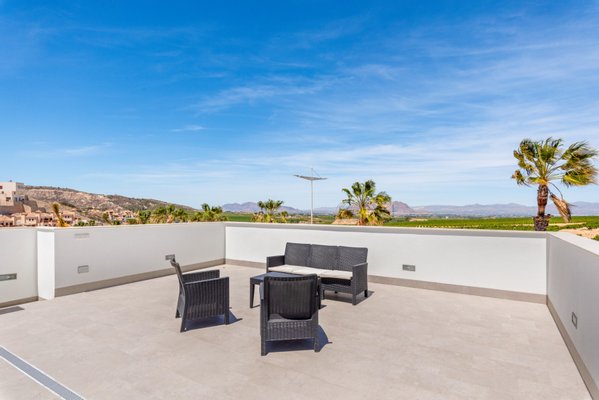 Die Villen werden nach den besten Qualitätsstandards gebaut, um Luxuswohnungen zu schaffen, die sich optimal an die mediterrane Umgebung anpassen und einen einzigartigen Raum mit privilegierten Aussichten schaffen. Die Häuser sind alle auf einer Ebene gebaut und die Innenaufteilung besteht aus einer Eingangshalle, die zu einem geräumigen, offenen Wohn- und Essbereich mit großen Fenstern führt, die sich zur Terrasse und zum Garten hin öffnen, einer voll ausgestatteten, modernen Küche im amerikanischen Stil, einem Hauptschlafzimmer mit eigenem Bad, zwei weiteren Doppelschlafzimmern, von denen jedes einen Zugang zur Terrasse oder zum Garten hat, und einem separaten Gästebad. Die große Terrasse und der Garten bieten viel Platz zum Entspannen und um Familie und Freunde in dem wunderbaren spanischen Klima zu unterhalten. Die Außentreppe an der Seite des Anwesens führt Sie auf die 87 m2 große Dachterrasse, wo Sie den ganzen Tag über die Sonne genießen können. Es ist eine Villa Option zur Verfügung, die einen privaten Swimmingpool auf dem Grundstück umfasst.