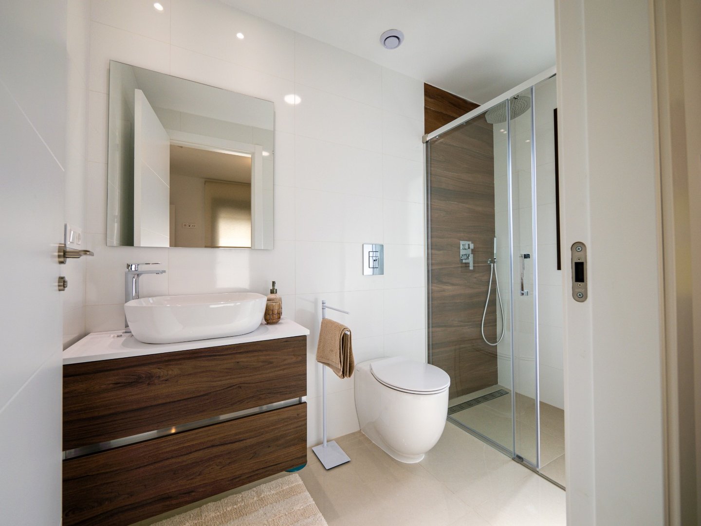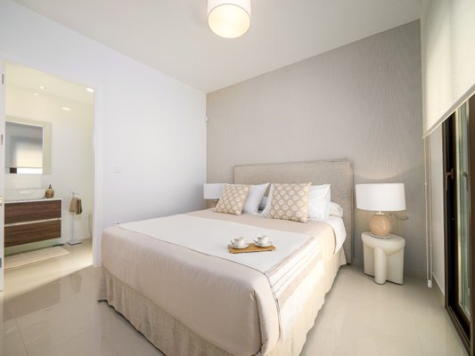 Das Innere der Wohnungen besteht aus einer Eingangshalle, die zu einem geräumigen, offenen Wohn- und Essbereich mit Terrassentüren zur Terrasse führt, einer voll ausgestatteten amerikanischen Küche, einem Hauptschlafzimmer mit eigenem Bad und Terrassentür zur Terrasse, einem weiteren Doppelschlafzimmer und einem separaten Gästebad. Die Wohnungen im obersten Stockwerk verfügen über eine Außentreppe, die auf die weitläufige Dachterrasse führt, die je nach Modell zwischen 31 m2 und 61 m2 groß ist.