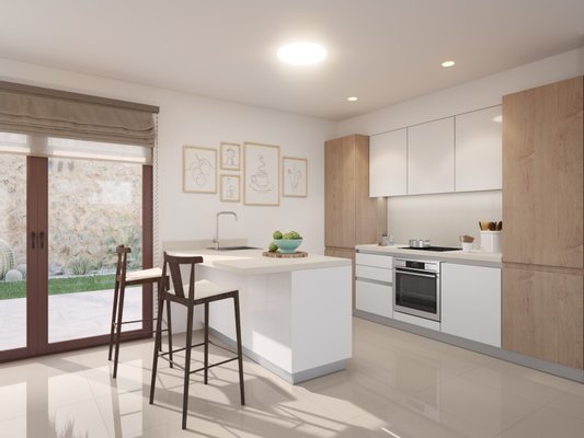 Der Komplex besteht aus 4 Gebäuden mit 5 Doppelhaushälften, die unterschiedlich aufgeteilt sind. Zur Auswahl stehen Wohnungen im Erdgeschoss mit eigenem Garten oder Dachgeschosswohnungen mit einer großen Dachterrasse, auf der Sie den ganzen Tag die Aussicht und die Sonne genießen können. Es gibt auch Stadthäuser mit 3 Schlafzimmern, die über zwei Etagen verteilt sind, für Familien, die von ihrem Haus aus einen Garten und eine spektakuläre Aussicht genießen möchten. Die Südausrichtung bietet den ganzen Tag über Sonne und natürliches Licht zu jeder Jahreszeit sowie eine natürliche Heizung von Sonnenaufgang bis Sonnenuntergang, was den Energieverbrauch reduziert. Das offene Konzept der Wohnungen mit Fenstern und Schiebetüren ermöglicht eine Querlüftung und Lichtdurchflutung der Innenräume.
