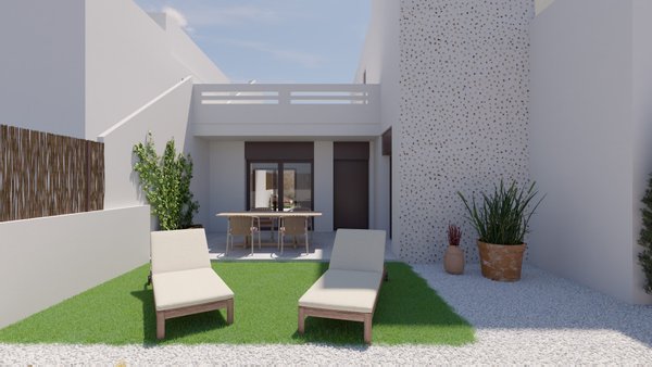 Das Innere der Reihenhäuser besteht aus einem geräumigen, offenen Wohn- und Essbereich mit Terrassentüren auf beiden Seiten des Wohnraums, die auf die vordere und hintere Terrasse und den Garten führen, einer voll ausgestatteten amerikanischen Küche, zwei Doppelschlafzimmern und einem separaten Gästebad im Erdgeschoss. Die Innentreppe führt Sie in den ersten Stock mit dem Hauptschlafzimmer mit eigenem Bad und das umfangreiche Solarium von 36m2, die über den ersten Stock Flur zugegriffen wird.