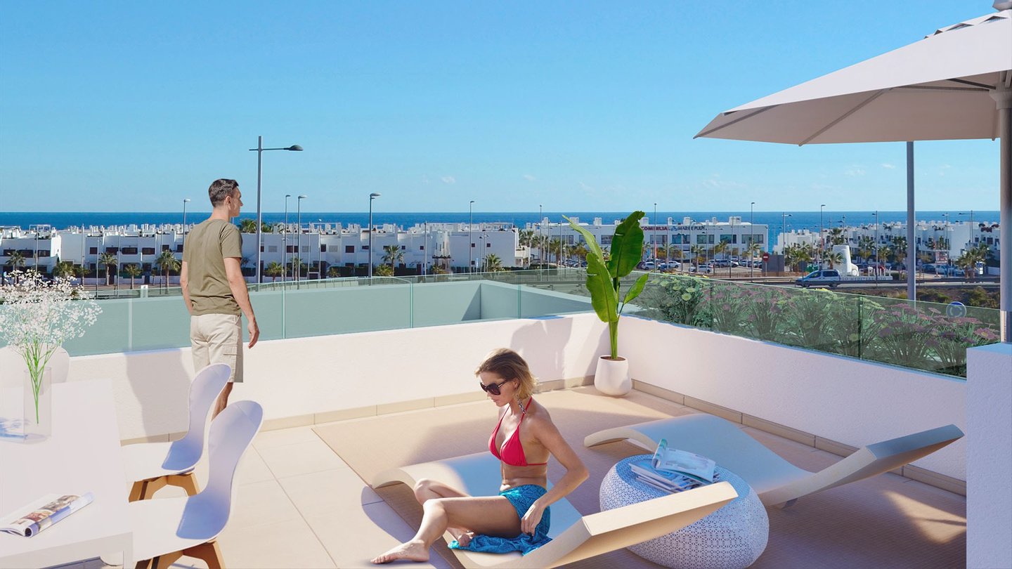 Ein brandneues Projekt von 10 Doppelhaushälften mit 2 und 3 Schlafzimmern, 2 Badezimmern, alle mit großzügigen Grundstücken und optionalem privatem Swimmingpool in San Juan de los Terreros (Almería), nur 400 Meter von den Stränden Playa Los Nardos und Playa La Entrevista entfernt und in der Nähe der Gemeinden Águilas und Vera. Eine privilegierte Lage mit einer Vielzahl von Dienstleistungen innerhalb der Wohngegend, darunter Restaurants, Supermarkt und Sportzentrum, die es Ihnen ermöglichen, das ganze Jahr über zu genießen. Die Anlage bietet Villen im andalusischen und mediterranen Stil, die für jeden Geschmack geeignet sind. Zur Auswahl stehen Villen mit 2 Schlafzimmern und 2 Bädern mit oder ohne Dachterrasse sowie Villen mit 3 Schlafzimmern und 2 Bädern mit Dachterrasse. Die Villen mit Sonnenterrasse bieten einen Blick auf das Mittelmeer am Horizont, den Sie von Ihrem eigenen Haus aus genießen können. Alle Villen erstrecken sich über zwei Ebenen mit einem Untergeschoss und verfügen über große Grundstücke mit Parkplätzen für zwei Fahrzeuge. Für jede Villa gibt es individuelle Gestaltungsmöglichkeiten, um die Villa einzigartig zu machen.  Die Innenaufteilung besteht aus einem Eingangsflur, der zu einem hellen, offenen Wohn- und Essbereich mit mehreren Terrassentüren führt, die Zugang zur Terrasse bieten, einer voll ausgestatteten, modernen Küche im amerikanischen Stil mit einem separaten Hauswirtschaftsraum, einem Doppelschlafzimmer mit Zugang zur Terrasse und einem separaten Gästebad. Die Innentreppe führt Sie in den ersten Stock mit zwei weiteren Doppelschlafzimmern, die beide Zugang zu einer privaten Sonnenterrasse haben, und einem zweiten separaten Gästebad. Über die Innentreppe gelangt man auch auf die 42 m2 große Dachterrasse und in das geräumige Untergeschoss mit englischem Patio, das viel natürliches Licht in den Raum bringt. Das Kellergeschoss bietet Ihnen die Möglichkeit, den Wohnraum nach Ihren Bedürfnissen und Anforderungen zu erweitern. Es gibt verschiedene optionale Extras zur Auswahl, einschließlich der Möglichkeit, verschiedene Möbelpakete zu wählen, um die Villen auf einem sehr hohen Standard einzurichten. Perfekt gelegen an der Grenze zwischen Almeria und Murcia, in der Nähe aller guten Straßennetze und eines Eisenbahnnetzes, das eine Zugfahrt zu jedem gewünschten Ziel ermöglicht, einschließlich der größeren Städte Pulpí, Aguilas, Murcia und darüber hinaus, mit ihren verschiedenen Einkaufszentren und dem Angebot an Dienstleistungen, die mit viel größeren Städten verbunden sind. Genießen Sie die Strände von La Entrevista und Los Nardos, die sich durch ihr kristallklares Wasser auszeichnen, das zum Tauchen und Schnorcheln einlädt. Ganz in der Nähe finden Sie außerdem die Strände von San Juan de los Terreros, Mar Serena, Mar Rabiosa, Calipso und viele andere. Für Golfliebhaber sind die schönen Golfplätze von Aguilón Golf und Desert Spring Golf nur 3 km von der Anlage entfernt. Die Stadt beherbergt die größte Geoda Europas, die in einer Höhle unter der Erde verborgen ist, die größte in Europa und die einzige Geoda, die besichtigt werden kann. San Juan de los Terreros ist ein echtes Juwel in einer Gegend, die das ganze Jahr über von einer multinationalen Gemeinschaft genossen wird und dennoch einen sehr spanischen Charme hat. Eingebettet zwischen dem wunderschönen Mittelmeer und der herrlichen Kulisse der Sierra Aguilon im Hintergrund, bietet es wunderschöne Aussichten und ein einzigartiges Mikroklima, geschützt vor der Kälte Europas, und genießt 360 Sonnentage. Es gibt eine Reihe von Flughäfen zur Auswahl, 55 Minuten Fahrt ist Corvera (Murcia) und Almeria Flughäfen, oder eine Stunde und eine halbe Fahrt ist Alicante Flughafen.