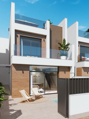 Ein brandneuer Komplex von 8 freistehenden Villen mit 3 Schlafzimmern, 2 Bädern und privatem Swimmingpool in San Pedro del Pinatar (Murcia), umgeben von allen Annehmlichkeiten, Sportanlagen, in der Nähe von mehreren Golfplätzen und nur 5 Minuten vom
