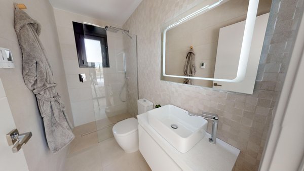 Die Innenaufteilung besteht aus einem Eingangsflur, der zum offenen Wohn- und Essbereich mit einer modernen amerikanischen Küche führt, einem separaten Hauswirtschaftsraum, einem Schlafzimmer mit Doppelbett und einem Badezimmer, das durch eine Doppeltür vom Schlafzimmer oder vom Flur aus zugänglich ist, im Erdgeschoss. Die Innentreppe führt Sie in den ersten Stock mit dem Hauptschlafzimmer mit eigenem Bad und Ankleidebereich, ein weiteres Doppelzimmer mit eigenem Bad, und beide Schlafzimmer im ersten Stock haben Zugang zur großen Sonnenterrasse von 26m2. Der Außenbereich im Erdgeschoss bietet viel Platz für das Leben im Freien mit einer großen Terrasse mit Sommerküche, Gartenbereich, privatem Schwimmbad von 15m2, und einen privaten Parkplatz auf dem Grundstück.