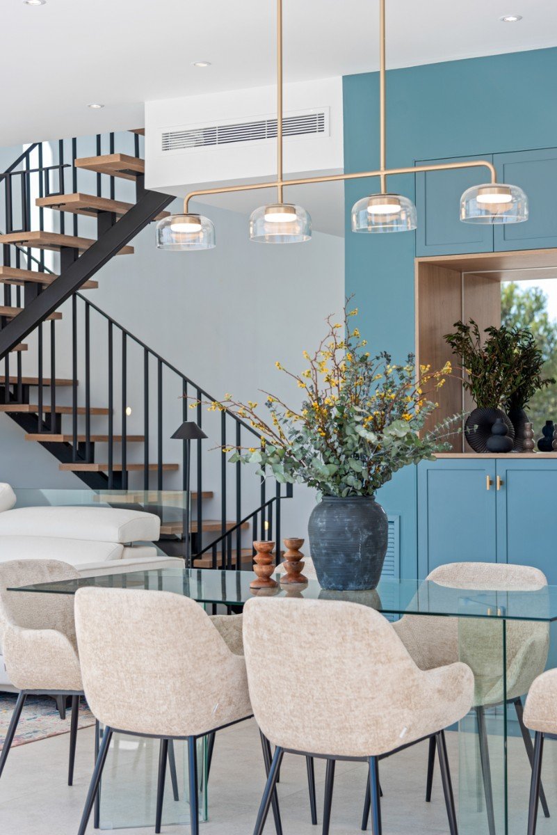 Die Innenaufteilung besteht aus einem geräumigen, offenen Wohn- und Essbereich mit großen Fenstern im gesamten Wohnbereich, die viel natürliches Licht hereinlassen und sich vollständig öffnen lassen, so dass Innen- und Außenbereich zu einer Einheit verschmelzen, einer modernen, voll ausgestatteten Küche im amerikanischen Stil mit Kochinsel und Terrassentüren, die Zugang zur Terrasse bieten, einer Gästetoilette und einem großen Schlafzimmer mit Doppelbett und eigenem Bad im Erdgeschoss. Die Innentreppe führt Sie in den ersten Stock mit der beeindruckenden Master-Suite mit eigenem Bad und dem erstaunlichen begehbaren Kleiderschrank / Ankleidebereich, das Master-Schlafzimmer verfügt über besondere Merkmale mit den großen Fenstern, die in allen Ansichten und hat auch Zugang zu einer privaten Sonnenterrasse von 15m2. Der erste Stock hat auch ein weiteres Schlafzimmer mit Doppelbett und en-suite Badezimmer und hat Zugang zu einer privaten Terrasse von knapp über 4m2.