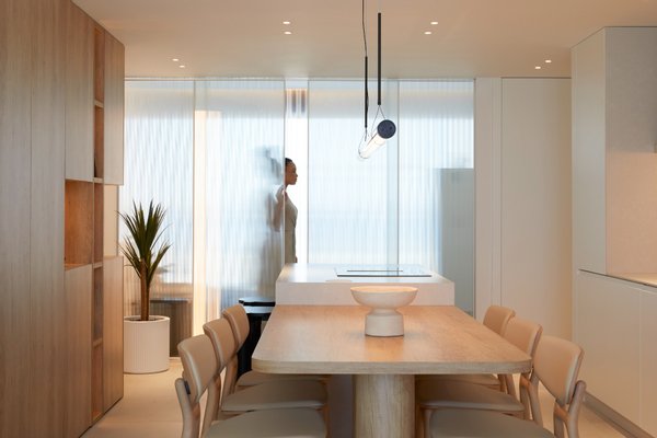 Unter der Leitung eines preisgekrönten Innenarchitekturstudios werden anspruchsvolle Innenräume mit einem warmen Minimalismus definiert, in dem Weiß, Texturen und die subtile Präsenz von Kurven ehrliche, komfortable und ruhige Umgebungen schaffen. Das Ziel ist es, das Gefühl von frischer Luft und die Ruhe einer beispiellosen mediterranen Oase zu vermitteln. Es wird ein perfektes Gleichgewicht zwischen Modernität und Freundlichkeit erreicht. Eine Palette von weißen, gebrochenen, rohen, haselnussbraunen oder gerösteten Farbtönen, gesprenkelt mit der leichten Präsenz von Holz, verschmilzt in einer Umgebung mit klaren und hellen Oberflächen. Schwarze Farbtöne, die in den Holzverkleidungen im Außenbereich und in wenigen, aber sorgfältigen Möbelstücken vorkommen, bestimmen den zeitgenössischen Charakter des Wohnbereichs. Messing vervollständigt die raffinierte Auswahl an Materialien und bringt die Raffinesse und Exklusivität, die der Komplex verlangt.