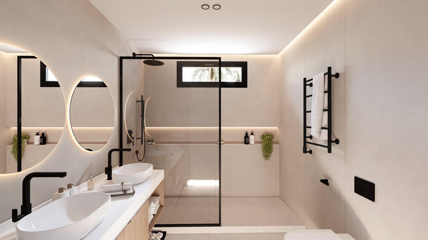 Die Innenausstattung ist der Inbegriff von Modernität, mit großzügigen Räumen, die über den Durchschnitt hinausgehen, und einer offenen, schicken Küche, die mit hochwertigen Geräten ausgestattet ist und den anspruchsvollen Geschmack derjenigen bedient, die kulinarische Exzellenz schätzen. Die Residenz verfügt außerdem über einen privaten Garten, einen privaten Swimmingpool und eine Terrasse mit Grillplatz. Diese Außenbereiche sind so konzipiert, dass sie sich nahtlos in die Umgebung einfügen und ein hohes Maß an Abgeschiedenheit gewährleisten. Der Grundriss der Villa befindet sich auf einer Ebene und besteht aus einem Eingangsflur, der zum geräumigen, offenen Wohn- und Essbereich mit großen Fenstern im gesamten Wohnbereich führt, die viel natürliches Licht und Zugang zur Terrasse und zum Garten bieten, einer voll ausgestatteten, modernen Küche im amerikanischen Stil mit einer Insel in der Mitte, einer separaten Waschküche, die vom Inneren oder Äußeren des Hauses aus zugänglich ist, und einem Gäste-WC. Zwei separate Flure führen zu den Schlafzimmern, der beeindruckenden Master-Suite mit großem Schlafzimmer, en-suite Badezimmer und begehbarem Kleiderschrank / Ankleidebereich, zwei weiteren Doppelschlafzimmern (eines mit en-suite Badezimmer) und einem separaten Gästebad. Die Häuser verfügen über eine voll installierte Klimaanlage, Fußbodenheizung im Wohnzimmer und in den Bädern, Küchengeräte (Induktionskochfeld und Dunstabzugshaube), Einbauschränke und USB-Steckdosen in allen Schlafzimmern, ein Hausautomatisierungssystem, eine Gegensprechanlage, LED-Beleuchtung innen und außen, einen Privatparkplatz auf dem Grundstück, einen angelegten Garten und einen privaten Swimmingpool (Größe je nach Villenmodell). Die Pflege des Pools, der Gemeinschafts-, Privat- und Dachgärten wird im Rahmen der Gemeinschaftsgebühren der Eigentümer durchgeführt, so dass die Gärten immer in perfektem Zustand sind.