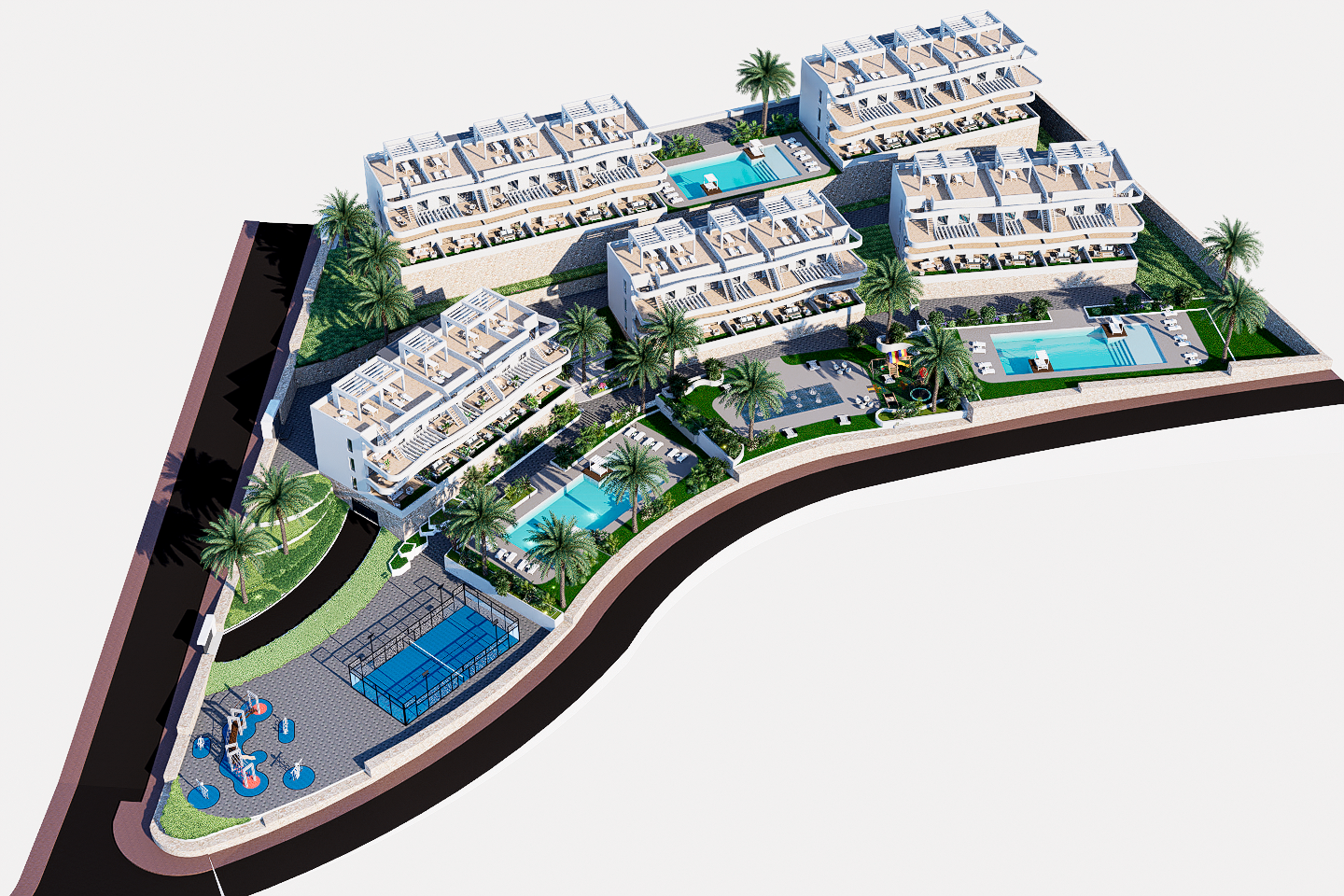 Die 78 Wohnungen verteilen sich auf 5 Wohnblocks mit modernem Design und hervorragender Bauqualität. Die Wohnungen verfügen über großzügige Terrassen und sind mit dem Aufzug in alle Stockwerke jedes Wohnblocks zu erreichen. Es handelt sich um eine private, geschlossene Wohnanlage, die den Bewohnern schöne Grünflächen mit 3 Gemeinschaftspools und Whirlpools, einen Wellnessbereich mit Fitnessstudio, Padel- und Tennisplatz sowie einen Kinderspielplatz mit Springbrunnen bietet.