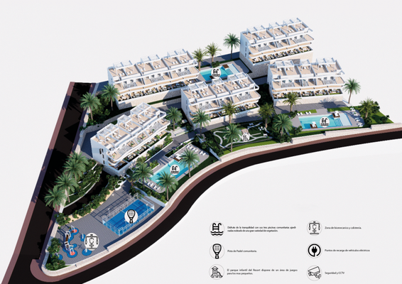 Die 78 Wohnungen verteilen sich auf 5 Wohnblocks mit modernem Design und hervorragender Bauqualität. Die Wohnungen verfügen über großzügige Terrassen und sind mit dem Aufzug in alle Stockwerke jedes Wohnblocks zu erreichen. Es handelt sich um eine private, geschlossene Wohnanlage, die den Bewohnern schöne Grünflächen mit 3 Gemeinschaftspools und Whirlpools, einen Wellnessbereich mit Fitnessstudio, Padel- und Tennisplatz sowie einen Kinderspielplatz mit Springbrunnen bietet.