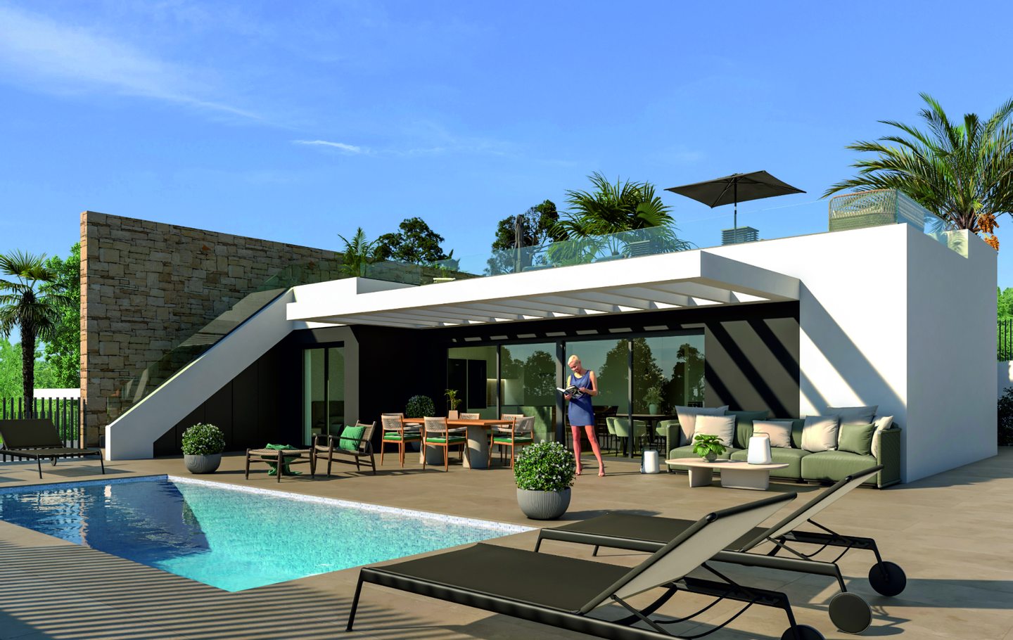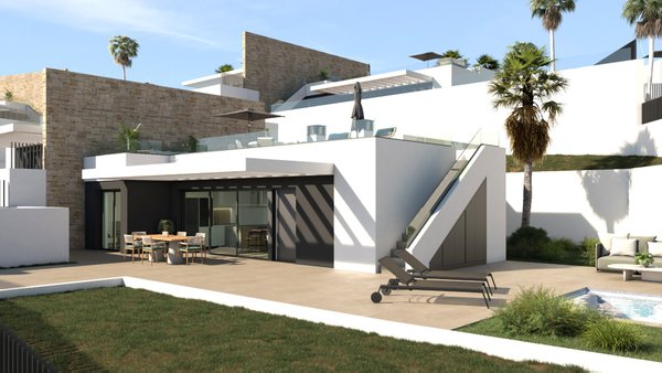 Jede Villa ist in einem modernen Stil und mit gut verteilten Räumen gestaltet. Die Villen bieten den perfekten Rahmen, um unvergessliche Erinnerungen mit Familie und Freunden zu schaffen. Die Innenausstattung besteht aus einem hellen und geräumigen offenen Wohn- und Essbereich mit großen Fenstern, die sich zum Außenbereich hin öffnen, einer voll ausgestatteten amerikanischen Küche mit Kochinsel und einem separaten Waschraum. Die Master-Suite verfügt über ein großes Schlafzimmer, ein eigenes Bad, einen Ankleidebereich und hat Terrassentüren, die auf die Hauptterrasse führen. Es gibt zwei weitere Doppelschlafzimmer (eines mit eigenem Bad) und ein separates Gästebad. Die Villa verfügt über einen großen Außenbereich mit einem großen privaten Garten, Terrassenbereich und einen privaten Pool von 7x3, sowie eine Außentreppe auf der Terrasse, die Sie auf die Dachterrasse von 47m2 führt, um den ganzen Tag die Sonne zu genießen.