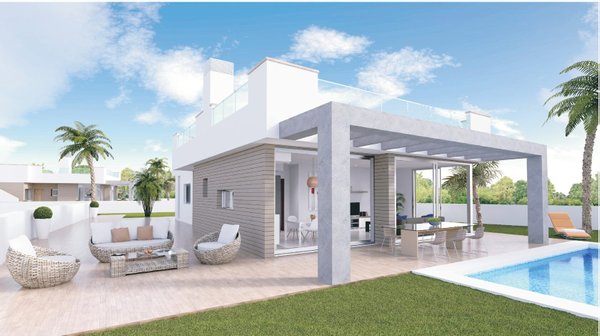 Die Innenaufteilung besteht aus einem Eingangsflur, der zum hellen und geräumigen offenen Wohn- und Essbereich mit großen, bodentiefen Fenstern im gesamten Wohnbereich führt, die für viel natürliches Licht sorgen und sich zum Außenbereich hin öffnen; im Hauptwohnbereich befindet sich eine voll ausgestattete moderne amerikanische Küche. Die Master-Suite verfügt über ein großes Schlafzimmer mit en-suite Badezimmer, es gibt zwei weitere große Doppelschlafzimmer und ein separates Gästebad. Die Villa verfügt über einen großzügigen Außenbereich mit Terrasse und Garten mit privatem Swimmingpool, um das Leben im Freien in Spanien zu genießen. Je nach Modell befindet sich an der Seite oder an der Rückseite des Hauses eine Außentreppe, die auf die große Dachterrasse führt, auf der man den ganzen Tag über die Sonne genießen kann. Die Villen verfügen über eine Klimaanlage, alle Elektrogeräte in der Küche, einen privaten Pool von 8 x 4 und einen privaten Parkplatz auf dem Grundstück.