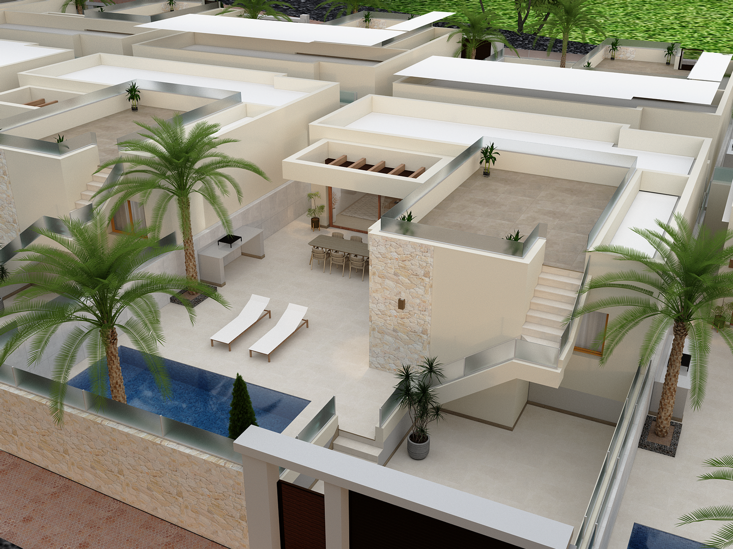 Diese Villen im modernen Stil sind alle ebenerdig und verfügen über einen geräumigen, offenen Wohn- und Essbereich mit großen Fenstern, die sich zum Außenbereich hin öffnen. Im Hauptwohnbereich befindet sich eine voll ausgestattete moderne Küche im amerikanischen Stil und eine separate Waschküche. Das Hauptschlafzimmer liegt mit Blick auf die Hauptterrasse und den Poolbereich und verfügt über ein großes Schlafzimmer und ein Bad en-suite. Es gibt noch zwei weitere große Doppelschlafzimmer und ein separates Gästebad. Der Außenbereich bietet einen weitläufigen privaten Garten und eine Terrasse mit einem 6 x 3 m großen Swimmingpool, der sich perfekt zum Entspannen in der Sonne und zum Essen im Freien eignet. Optional kann eine 33 m2 große Sonnenterrasse auf dem Dach hinzugefügt werden. Die Villen verfügen über eine Klimaanlage, elektrische Küchengeräte, Einbauschränke in allen Schlafzimmern, elektrische Jalousien, eine Gegensprechanlage und einen privaten Parkplatz auf dem Grundstück.