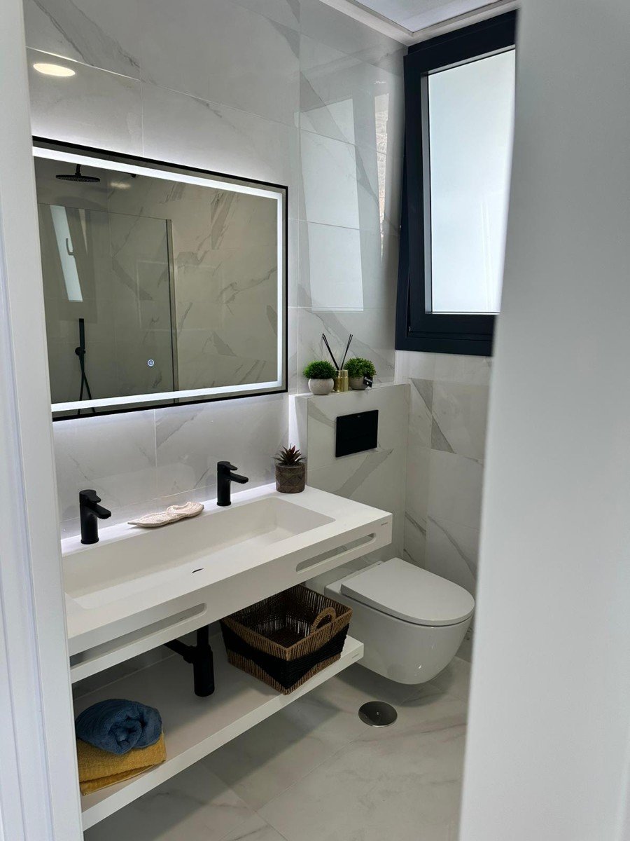 Die Villen erstrecken sich über zwei Ebenen mit einem zusätzlichen Kellergeschoss. Die Innenaufteilung besteht aus einem Eingangsflur, der zum hellen und geräumigen offenen Wohn- und Essbereich mit großen Fenstern im gesamten Wohnbereich führt und Zugang zur Terrasse und zum Garten bietet. Im Hauptwohnbereich befindet sich eine voll ausgestattete Küche im amerikanischen Stil mit einer Mittelinsel. Im Erdgeschoss befinden sich außerdem ein Schlafzimmer mit Doppelbett und Ankleidebereich sowie ein separates Gästebad. Die Innentreppe führt Sie in den ersten Stock mit zwei großen Doppelschlafzimmern, beide mit eigenem Bad und Zugang zur Terrasse mit Pergola. Über die Innentreppe gelangt man auch in das 94 m2 große Untergeschoss, wo sich ein großes Doppelschlafzimmer mit eigenem Bad und Ankleidebereich befindet. Der Bereich ist durch den schönen englischen Innenhof mit natürlichem Licht erfüllt und eignet sich perfekt für eine größere Familie oder wenn Gäste zu Besuch kommen. Im Untergeschoss befindet sich auch eine Waschküche und Sie haben Zugang zu einer privaten Garage.