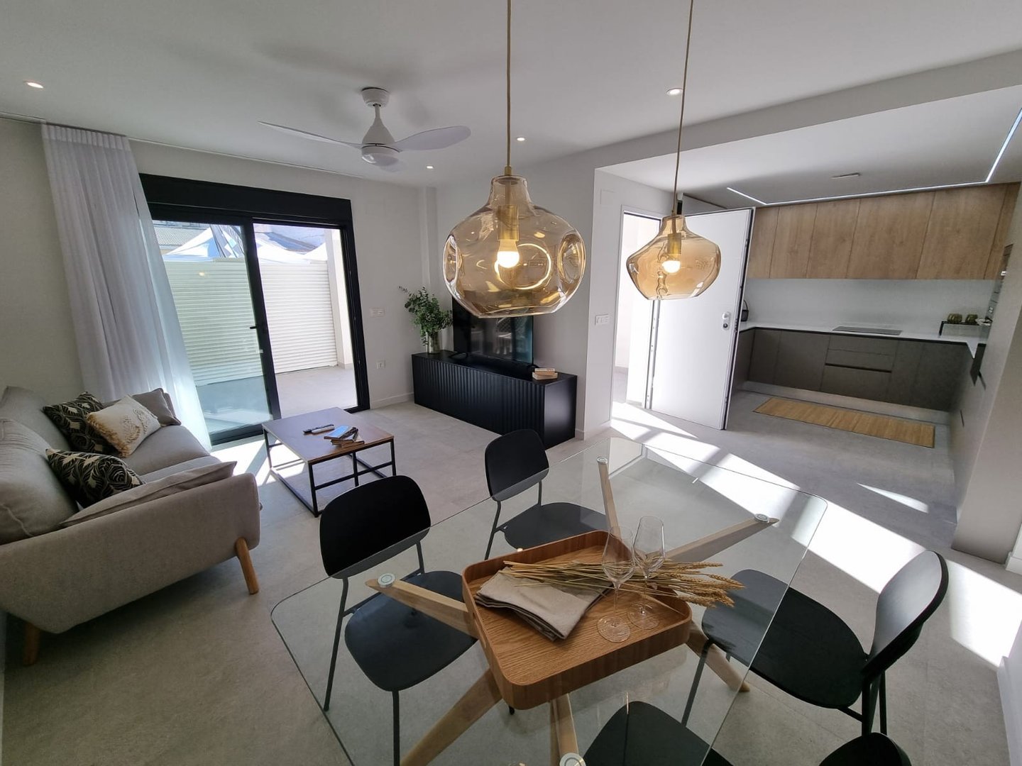 Die Innenräume sind elegant und funktional, die Aufteilung besteht aus einem geräumigen, offenen Wohn- und Essbereich mit Terrassentüren, die Zugang zur Terrasse bieten. Im Hauptwohnbereich befindet sich eine voll ausgestattete Küche im amerikanischen Stil mit Mittelinsel. Ein großes Hauptschlafzimmer mit eigenem Bad, ein weiteres Doppelschlafzimmer und ein separates Gästebad. Die Erdgeschossvarianten verfügen über Terrassen auf der Vorder- und Rückseite des Hauses, wobei das Hauptschlafzimmer Zugang zur hinteren Terrasse und das Wohnzimmer Zugang zur vorderen Terrasse hat. In der obersten Etage führt eine Außentreppe auf der Terrasse zur großen Dachterrasse, die ca. 67 m2 groß ist und eine Sommerküche enthält, die sich perfekt für Mahlzeiten im Freien eignet. Zu jeder Immobilie gehört ein privater Parkplatz innerhalb der Gemeinschaft.