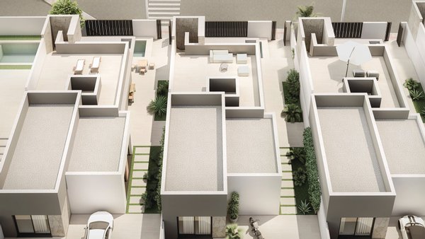 Das Projekt bietet 5 verschiedene Villen, entweder auf einer oder auf zwei Ebenen, die in einem modernen und minimalistischen Stil entworfen wurden. Dieses besondere Villenmodell befindet sich auf einer Ebene mit einer Dachterrasse. Die Innenaufteilung besteht aus einem Eingangsflur, der zum hellen und geräumigen offenen Wohn- und Essbereich mit großen Fenstern führt, die sich zum privaten Garten und Poolbereich hin öffnen. Im Hauptwohnbereich befindet sich eine amerikanische Küche mit einer Insel in mattem Weiß, ein separater Hauswirtschaftsraum, ein Gäste-WC und ein Abstellraum. Das große Hauptschlafzimmer hat ein eigenes Bad und eine Terrassentür, die auf eine private Terrasse führt. Es gibt zwei weitere, gut dimensionierte Doppelschlafzimmer und ein separates Gästebad. Die Villa genießt umfangreiche Außenbereich mit privatem Garten, große Terrassenflächen zum Entspannen und genießen Sie im Freien speisen, ein 15m2 privaten Swimmingpool, eine Außentreppe führt bis zu den großen Dachterrasse 48m2, um die Sonne den ganzen Tag lang zu genießen, und das Grundstück umfasst private Parkplätze für zwei Fahrzeuge.