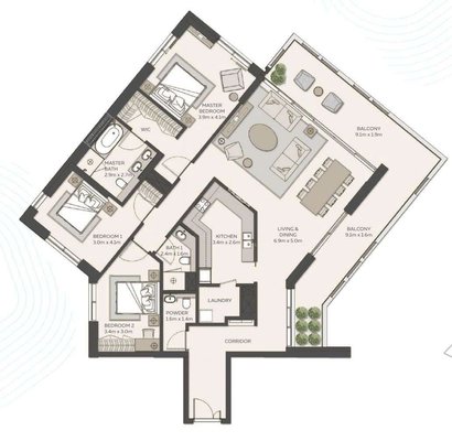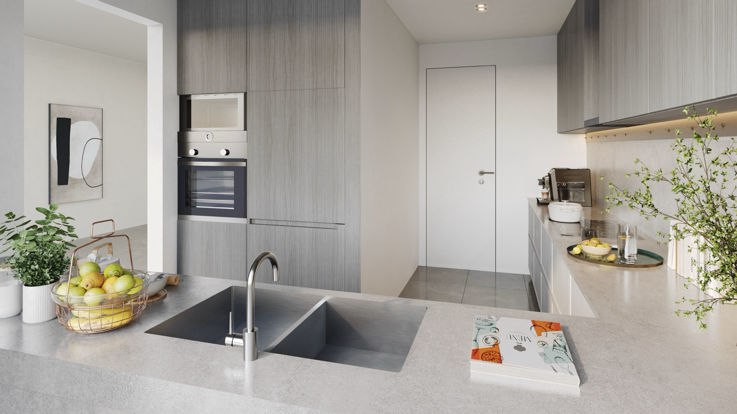 Willkommen in dieser luxuriösen 3-Zimmer-Wohnung, die mit einem elegante Doppelwaschbecken ausgestattet ist. Die bodentiefen Fenster sorgen für helle und freundliche Räume und bieten einen atemberaubenden Blick auf das markante Wasserspiel der Expo City.