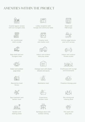 In der Freizeit können Bewohner die Annehmlichkeiten des Gebäudes nutzen, darunter einen Kinoraum, einen 60m langen Infinity-Edge-Pool, einen Kinderspielplatz, ein Yoga-Studio und einen Spa-Bereich. Zudem bieten sich in der Nähe zahlreiche Einkaufsmöglichkeiten, Restaurants und kulturelle Einrichtungen.