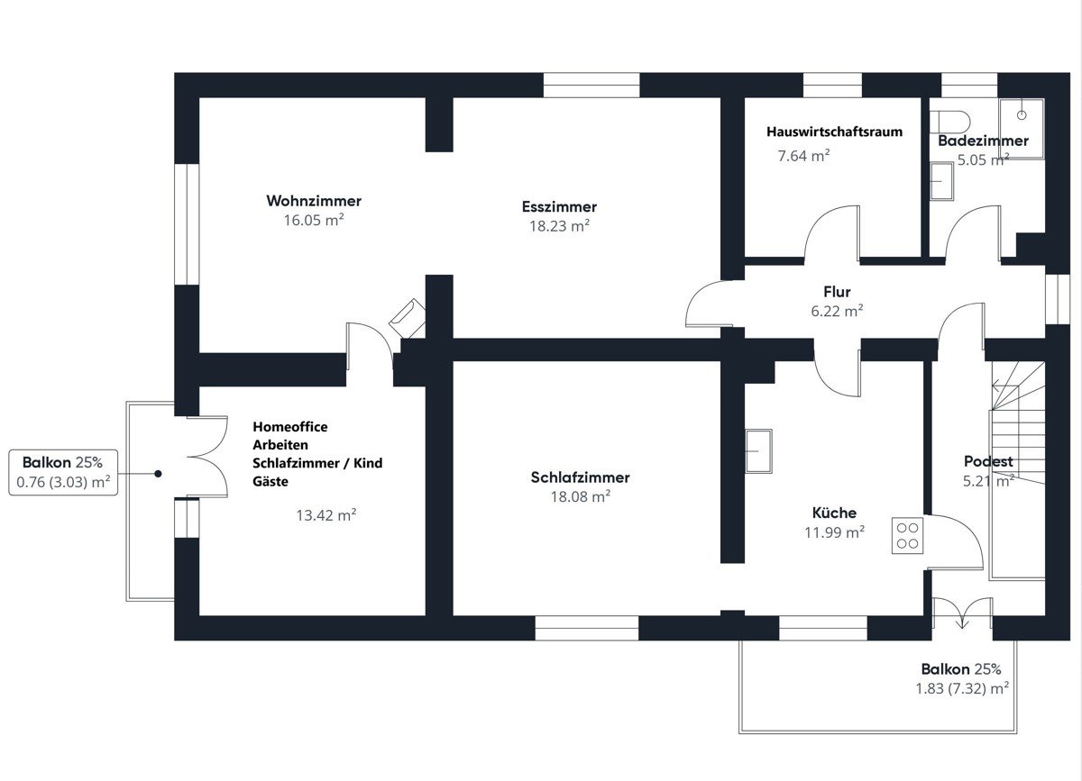 Durch die Abgeschlossenheit beider Wohneinheiten und das separate Treppenhaus können auch zwei Wohnungen genutzt bzw. extern vermietet werden. Dies schafft ein sehr interessantes Potential für Kapitalanleger.