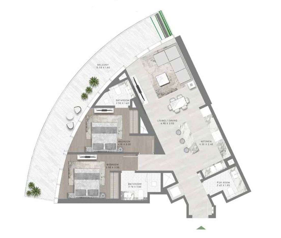 Willkommen in Ihrem neuen Zuhause! Betreten Sie die geräumige 2-Schlafzimmer-Immobilie und lassen Sie sich von den hochwertigen Fliesen und den großen bodentiefen Fenstern über die gesamte Front beeindrucken. Die helle und offene Wohnküche lädt zu