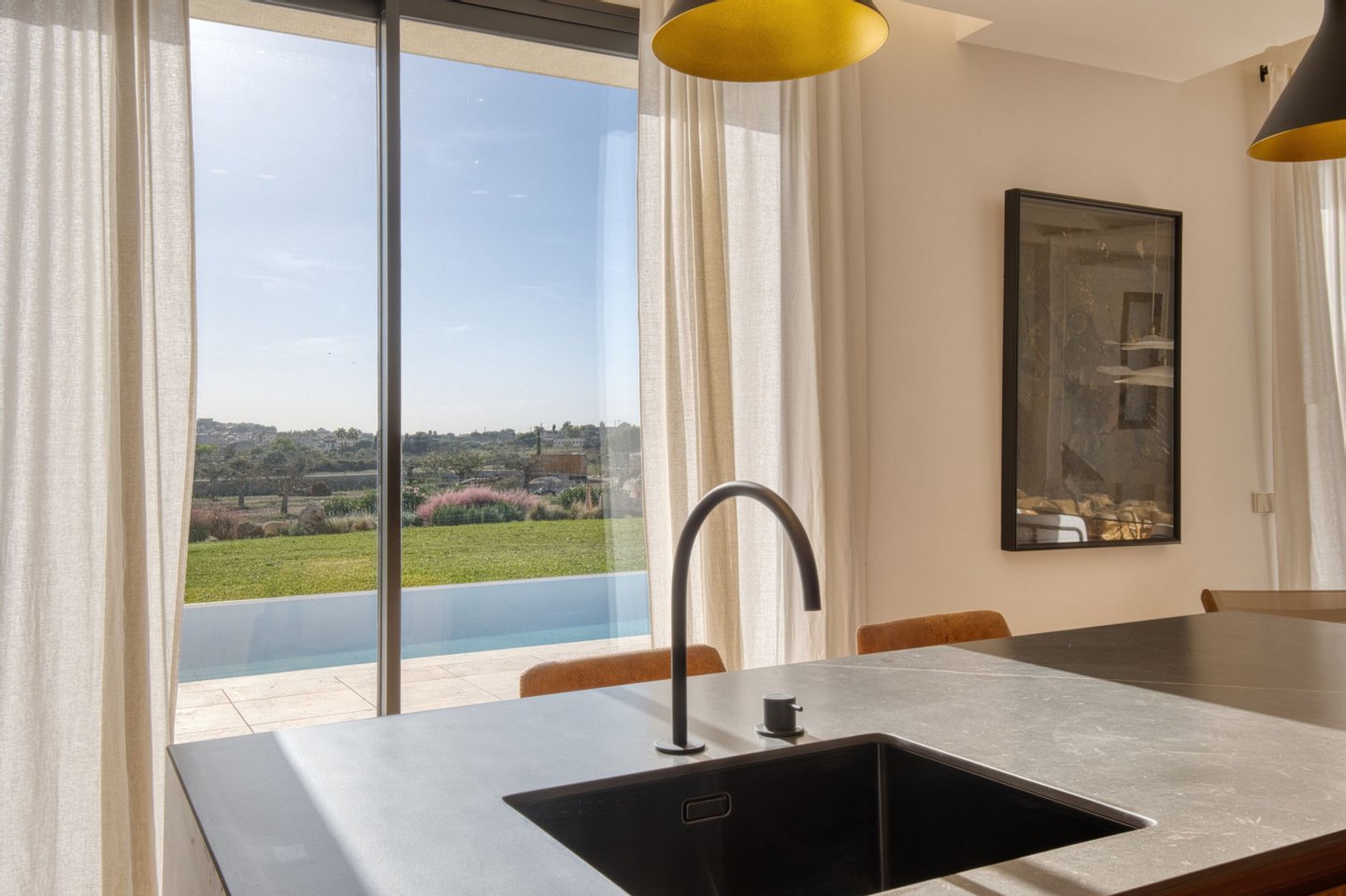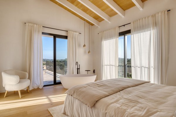 Auf der oberen Etage erwarten Sie 4 weitere Schlafzimmer, jedes mit eigenem Bad en suite. Die Master-Suite besticht mit einem Ankleideraum und direktem Zugang zur privaten Terrasse, von der aus Sie den spektakulären Blick auf die Landschaft und das Dorf genießen können. Eine schöne Veranda mit Grillplatz lädt zum Entspannen ein, während der schöne Pool eine erfrischende Abkühlung bietet.