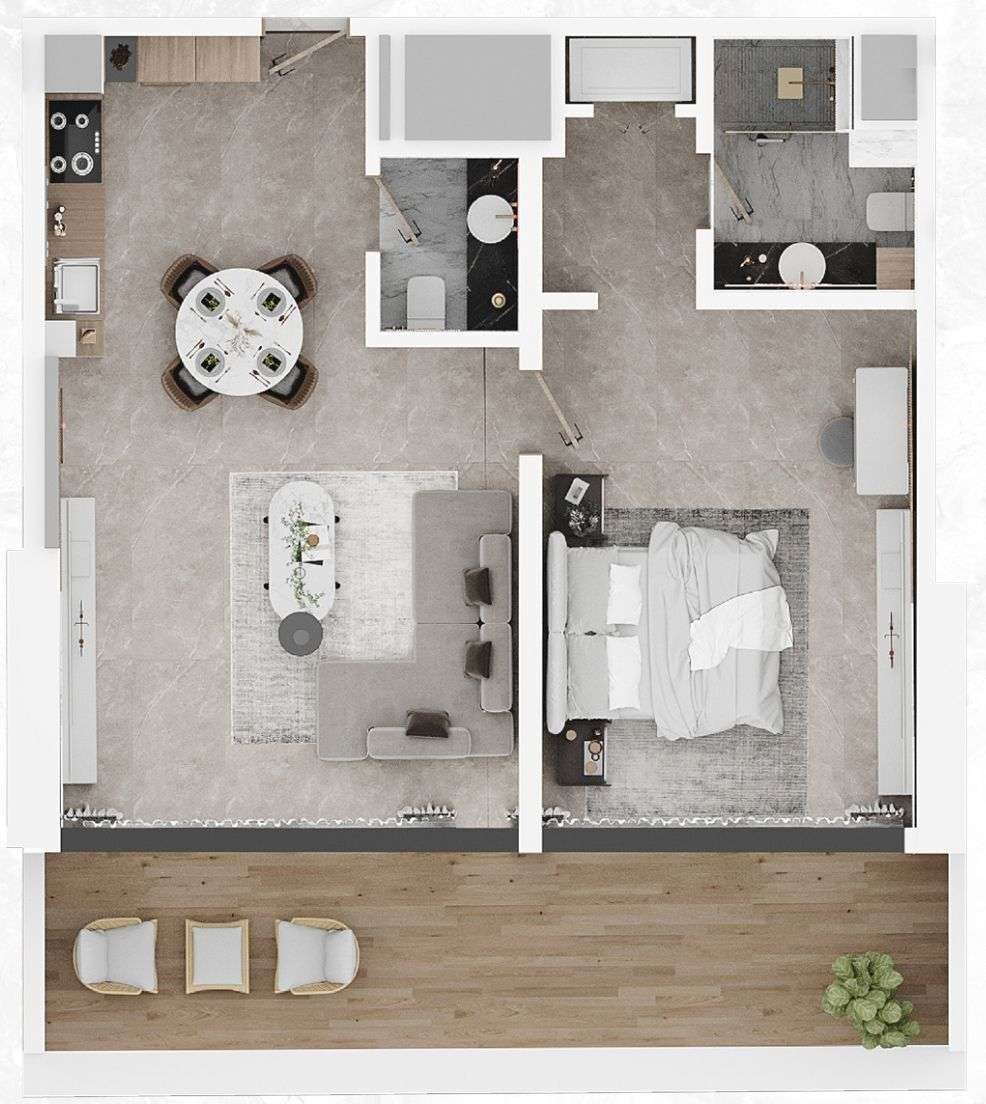 Willkommen in Ihrem neuen Zuhause! Betreten Sie die geräumige 1 Schlafzimmer-Wohnung und lassen Sie sich von dem modernen und hochwertigen Design begeistern. Die voll ausgestattete Küche lädt zum Kochen und Genießen ein. Der Balkon bietet einen herrlichen Ausblick und lädt zum Entspannen ein. Die bodentiefen Fenster über die ganze Front sorgen für eine lichtdurchflutete Atmosphäre. Das Badezimmer verfügt über eine luxuriöse Regendusche, perfekt für erholsame Stunden. Die eleganten Fliesen verleihen der Wohnung einen edlen und stilvollen Touch. Hier können Sie Wohnkomfort auf höchstem Niveau erleben.